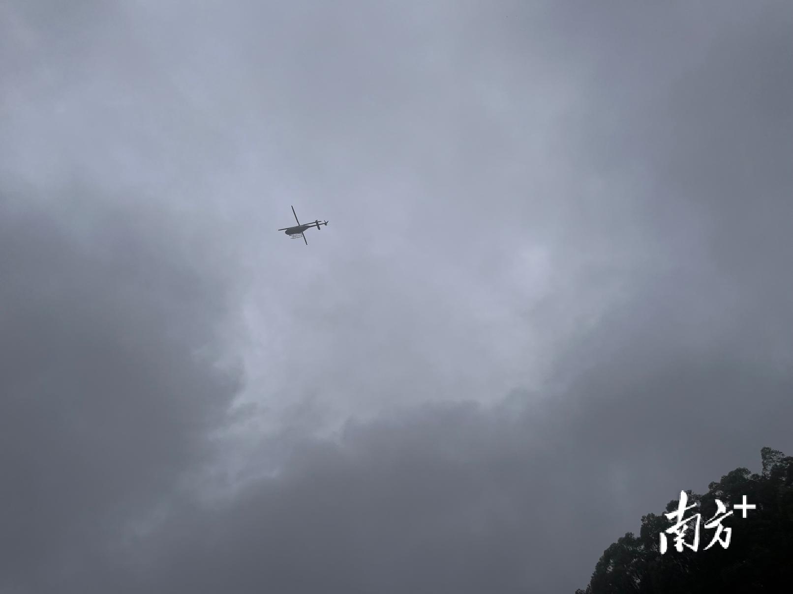 同时,伴随着螺旋桨巨大的轰隆声,一架直升机从天空掠过,往受灾最严重的中心区域飞去。