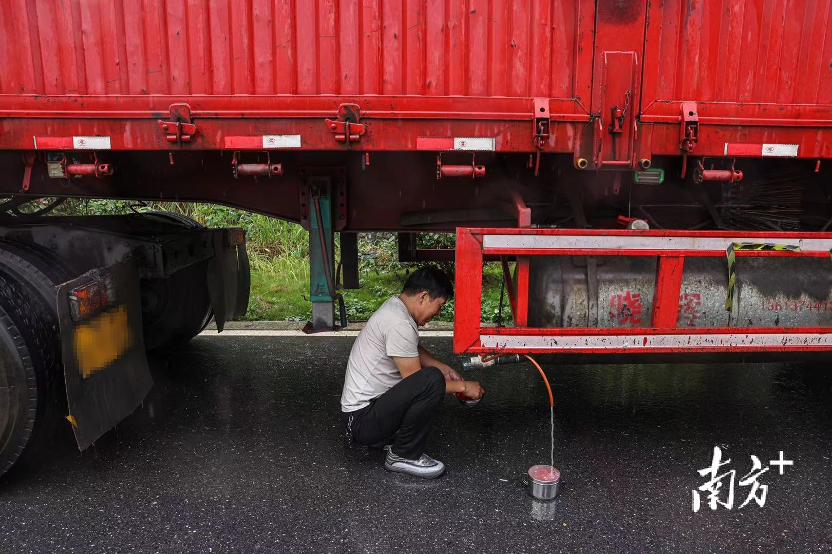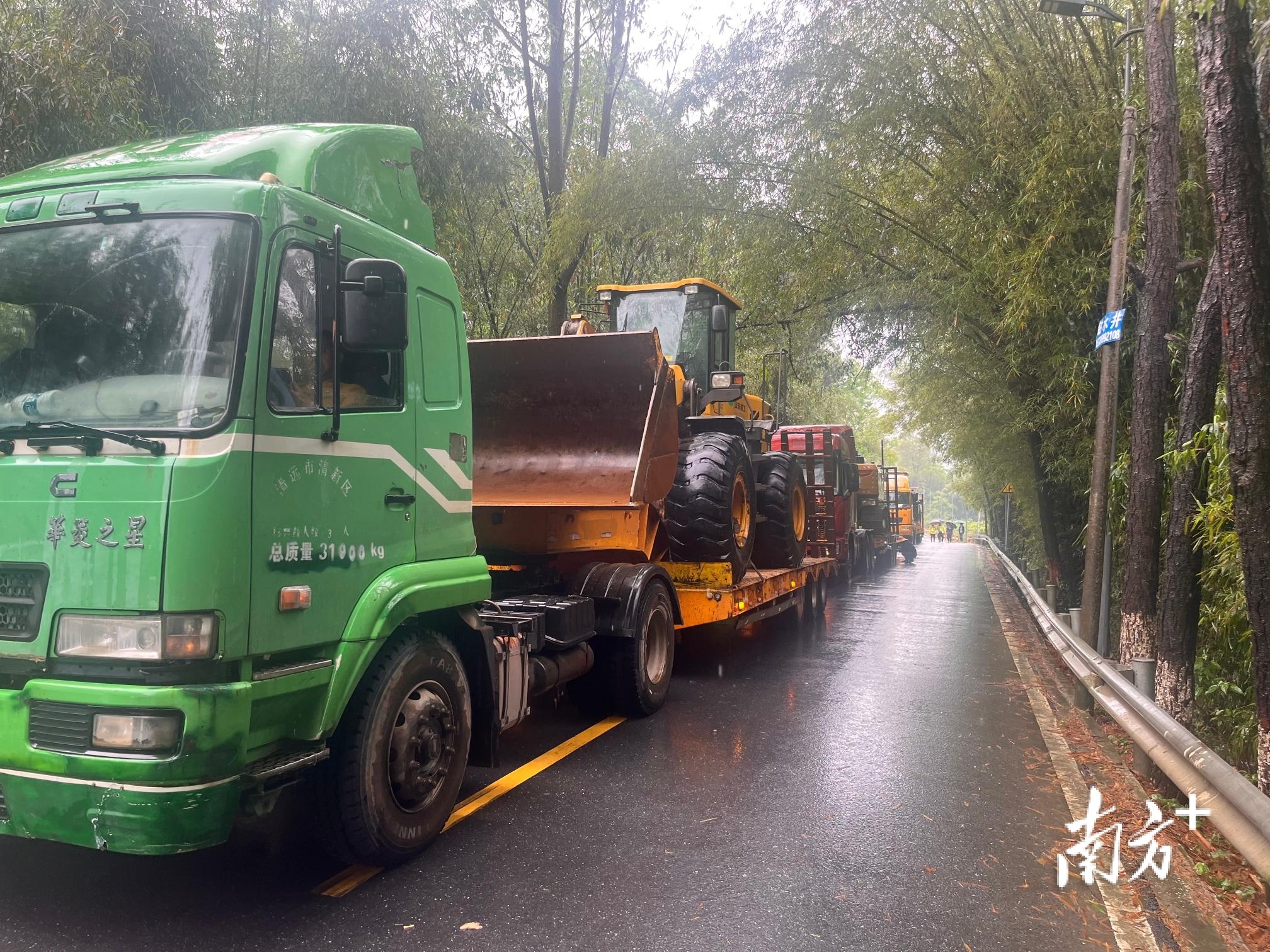 涉水路段外,记者见到了在重型卡车上等待的谢师傅。他们收到相关指示,凌晨从清远出发,早上5时许抵达江湾镇。路上,像谢师傅这样的“粤R”重卡有数十辆,车上装载着挖掘机、铲机等重型机械。他们等待着下一步指示,随时准备救援。