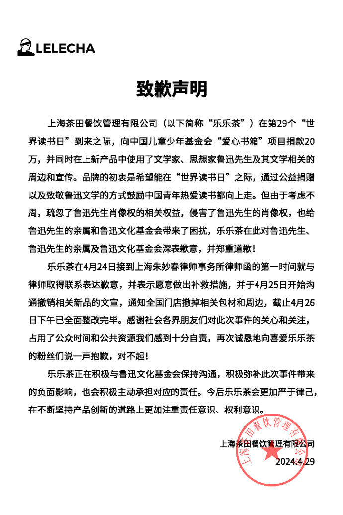 4月29日,乐乐茶发布声明,就“侵害鲁迅先生肖像权”一事对鲁迅先生、鲁迅先生的亲属及鲁迅文化基金会致歉。