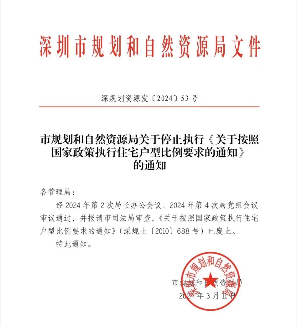 日前,互联网流传一份“深圳市规划和自然资源局关于停止执行《关于按照国家政策执行住宅户型比例要求的通知》”的文件。文件落款日期为2024年3月14日。