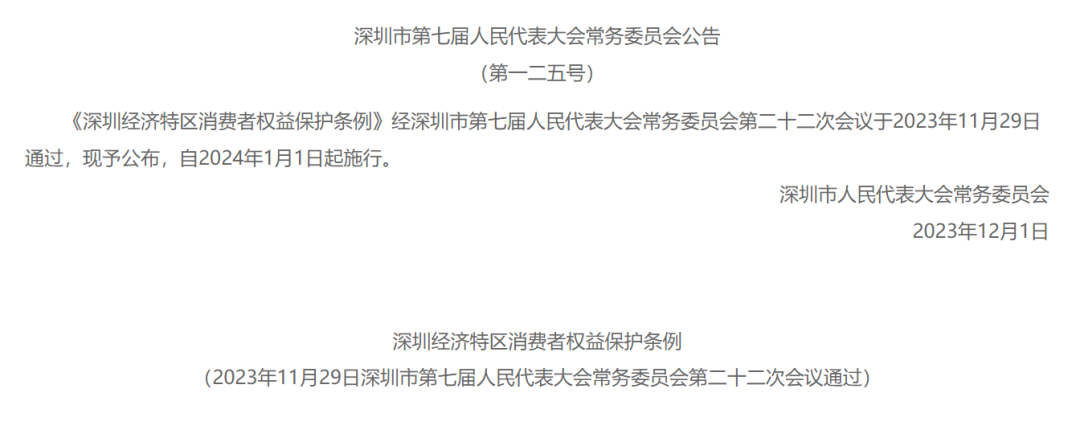 《深圳经济特区消费者权益保护条例》将于2024年1月1日起正式实施。