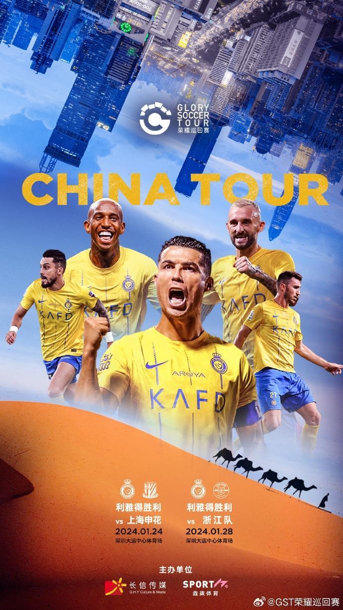 利雅得胜利中国行正式官宣!利雅得胜利中国行主办方正式发文确认,即将于1月24日、28日在深圳举办两场“荣耀巡回赛 2024利雅得胜利中国行”比赛。