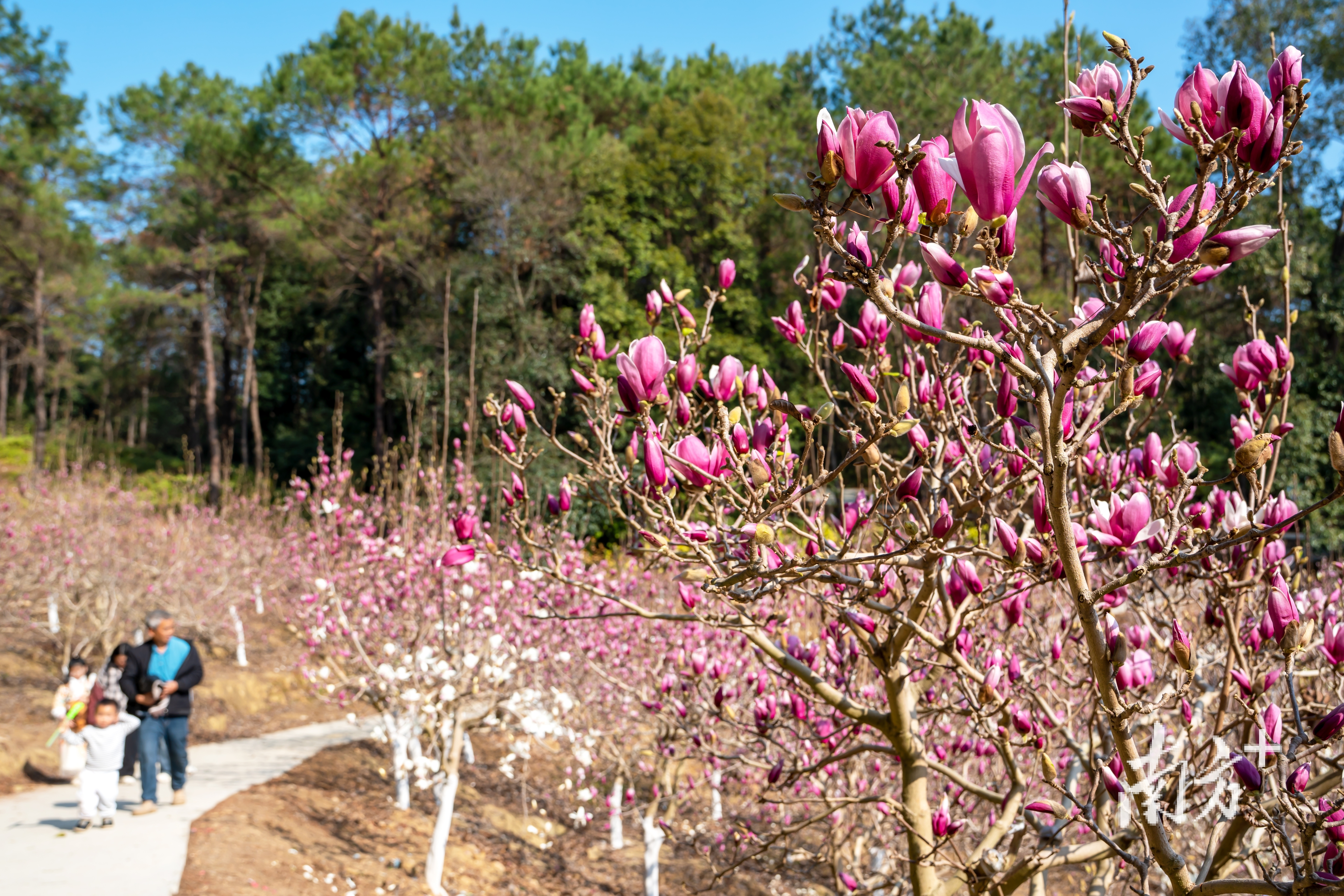 公园内,80亩桃花、8亩紫玉兰、7亩茶花以及樱花、山楂花、紫风铃等各式花卉竞相绽放,点缀着这片湖光山色的森林公园。