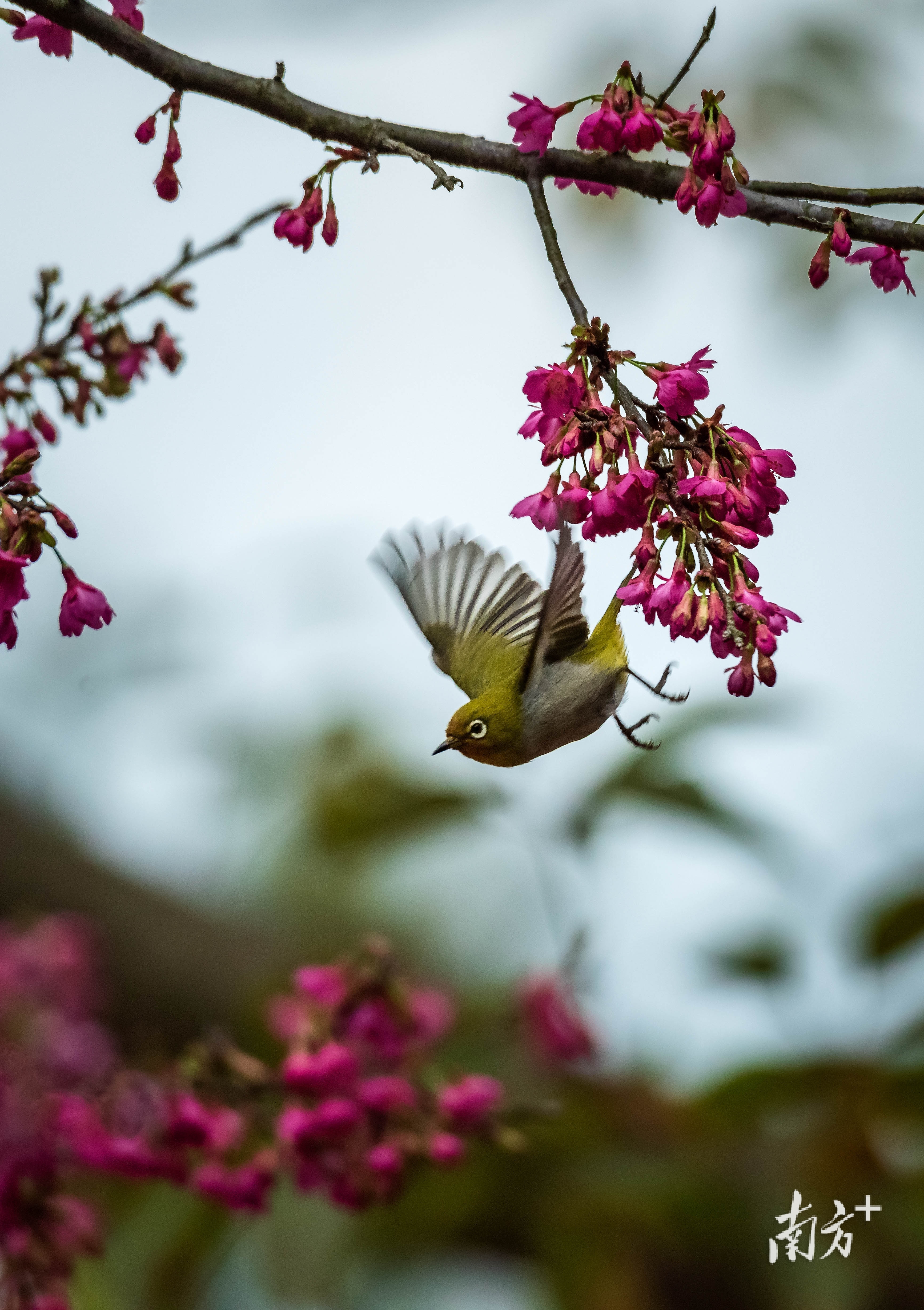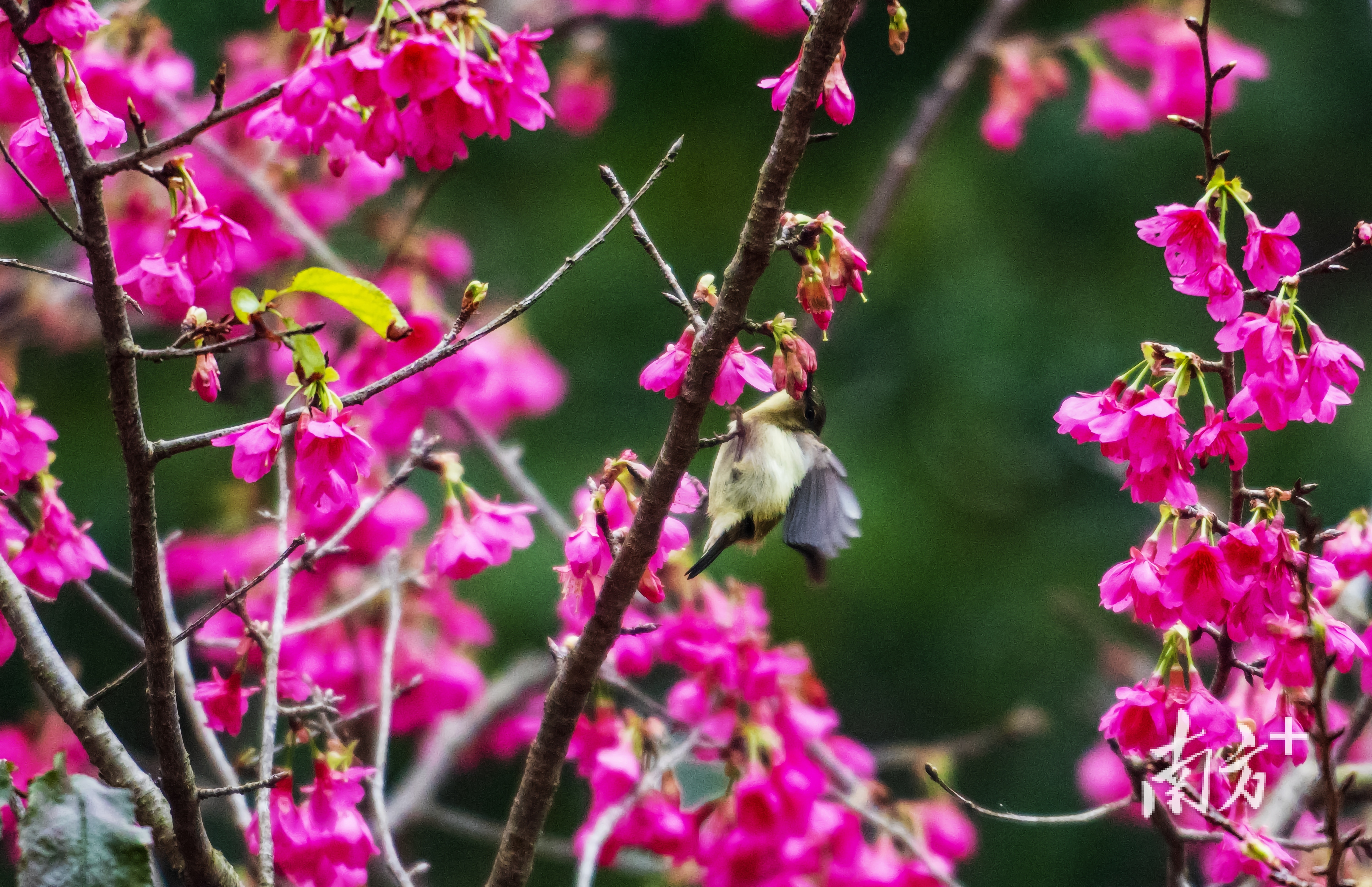 朵朵樱花散发着浪漫的气息,与鸟儿相映成趣。