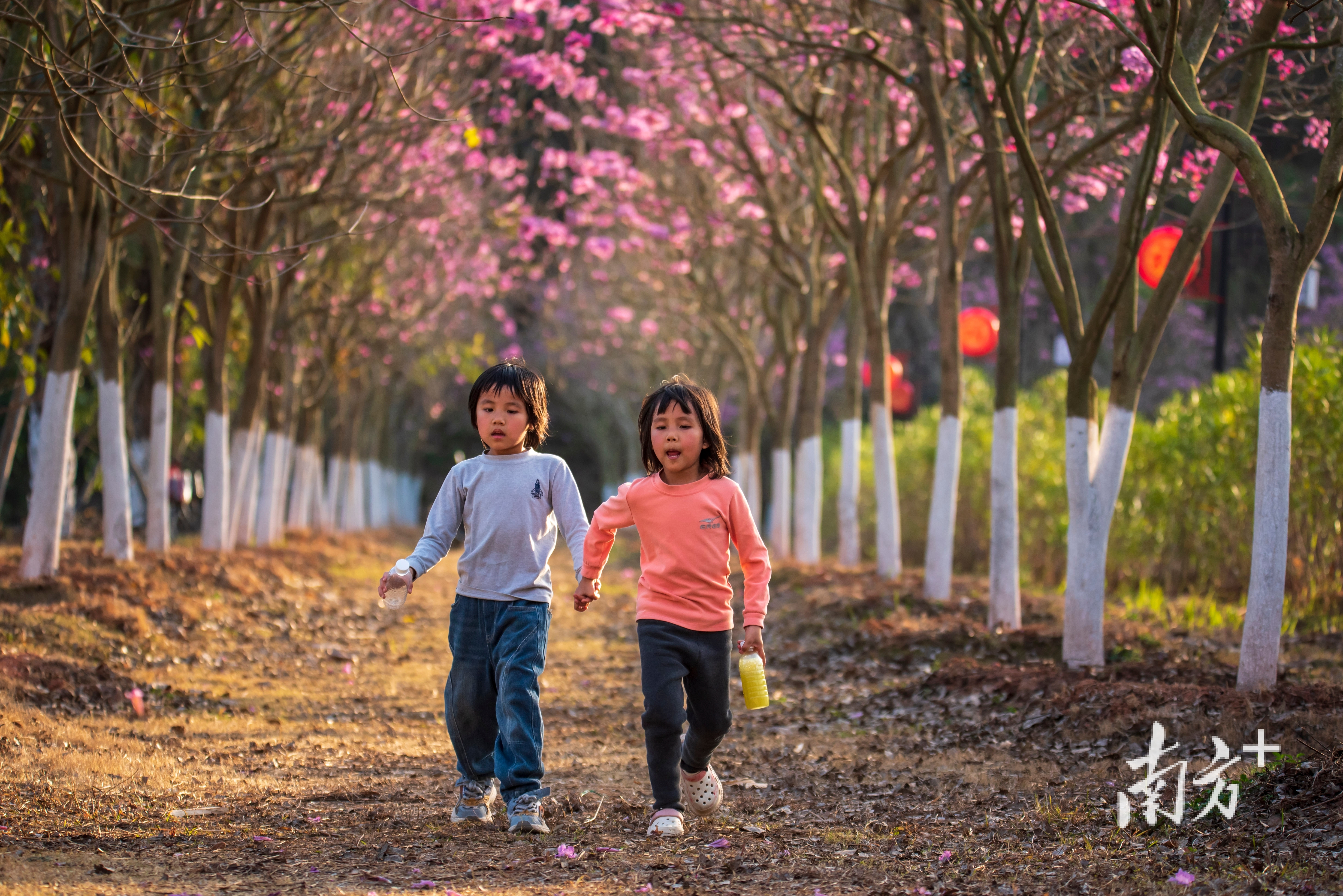 孩童在紫花风铃树下玩耍。谢汉庸 摄