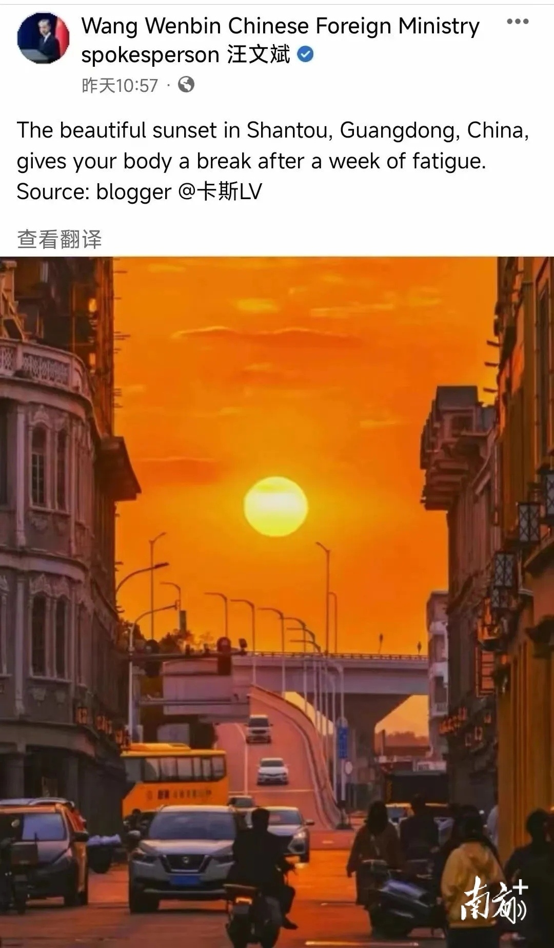 近日,外交部发言人汪文斌在社交媒体上发文,“在中国广东汕头,美丽的日落让你的身体在一周的劳累之后得到休息。”并配上汕头老市区日落视频。