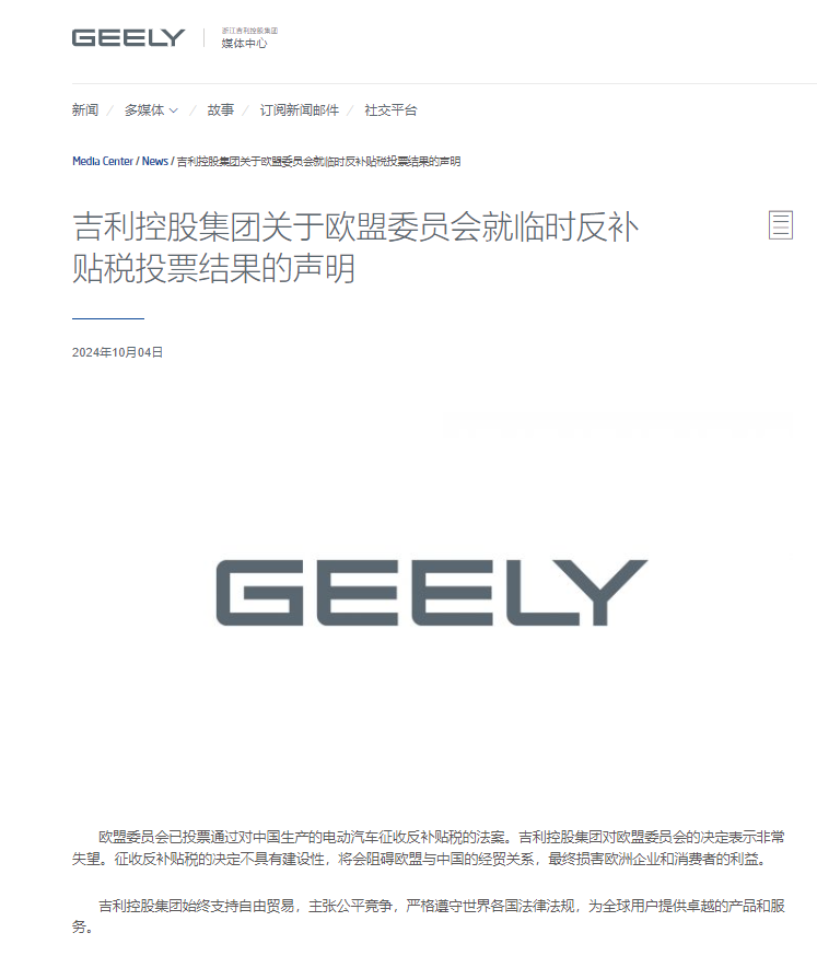 10月4日,吉利控股集团发布声明称,对欧盟委员会的决定表示非常失望。征收反补贴税的决定不具有建设性,将会阻碍欧盟与中国的经贸关系,最终损害欧洲企业和消费者的利益。吉利控股集团表示将始终支持自由贸易,主张公平竞争,严格遵守世界各国法律法规,为全球用户提供卓越的产品和服务。