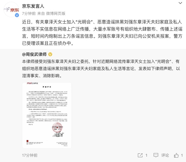 10月16日,@京东发言人 发布声明称,近日,有关章泽天女士加入“光明会”、恶意造谣抹黑刘强东章泽天夫妇家庭及私人生活等不实信息在网络上广泛传播,大量水军账号有组织地大肆散布、传播上述谣言,短时间内炮制出上万条谣言信息。刘强东章泽天夫妇已向公安机关报案,警方已受理该案且正在侦办中。 编辑 张梦圆 订阅后可查看全文(剩余80%)