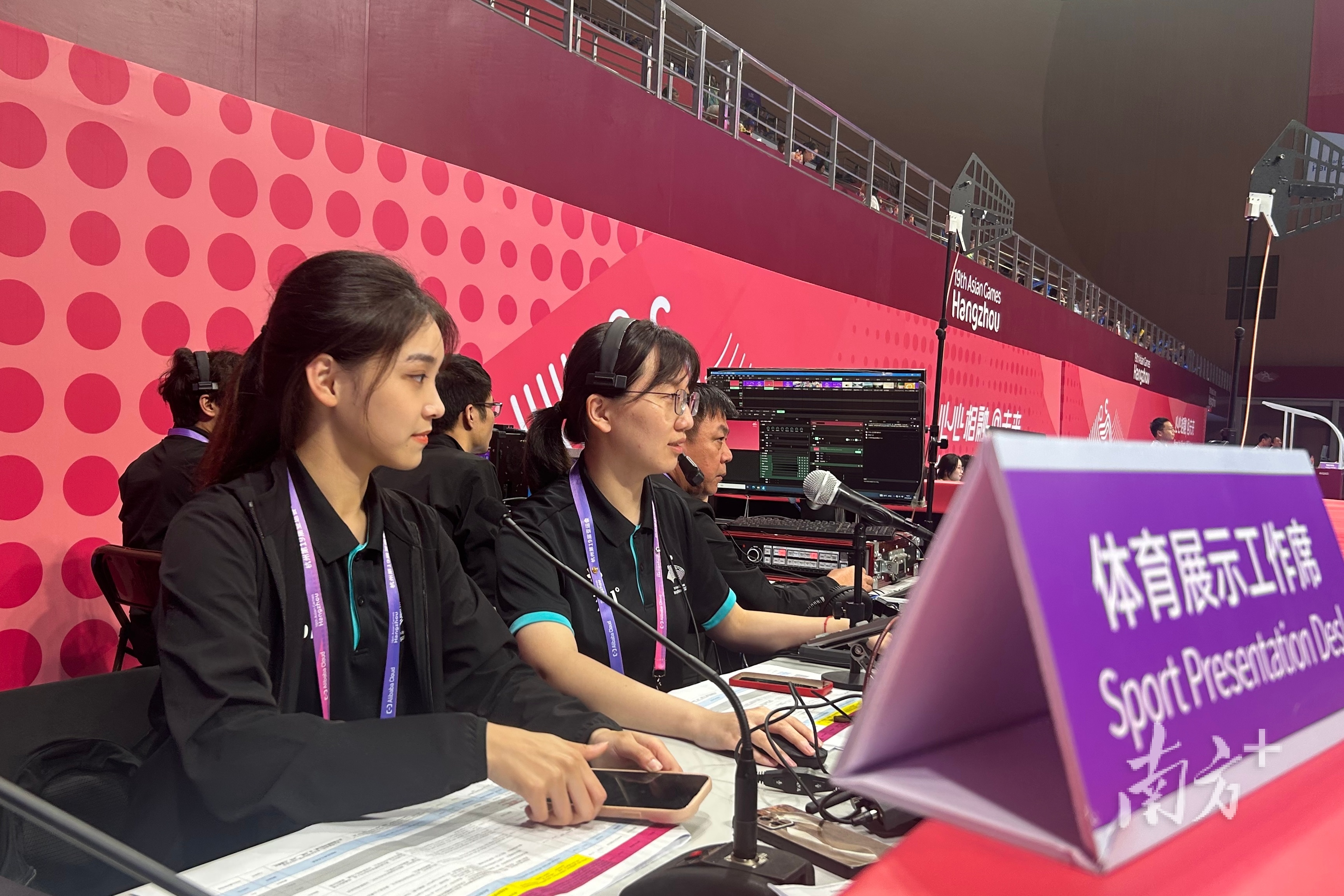 “加上啦啦操的表演人员,我们场馆总共有20多名体育展示的工作人员,包括导演、设备组、播报组等等,大部分是‘90后’和‘00后’。”1993年的丁斯妤年龄不大,却已经是各大体育赛事展示的专家,也是广州体育学院广播电视编导专业的讲师。