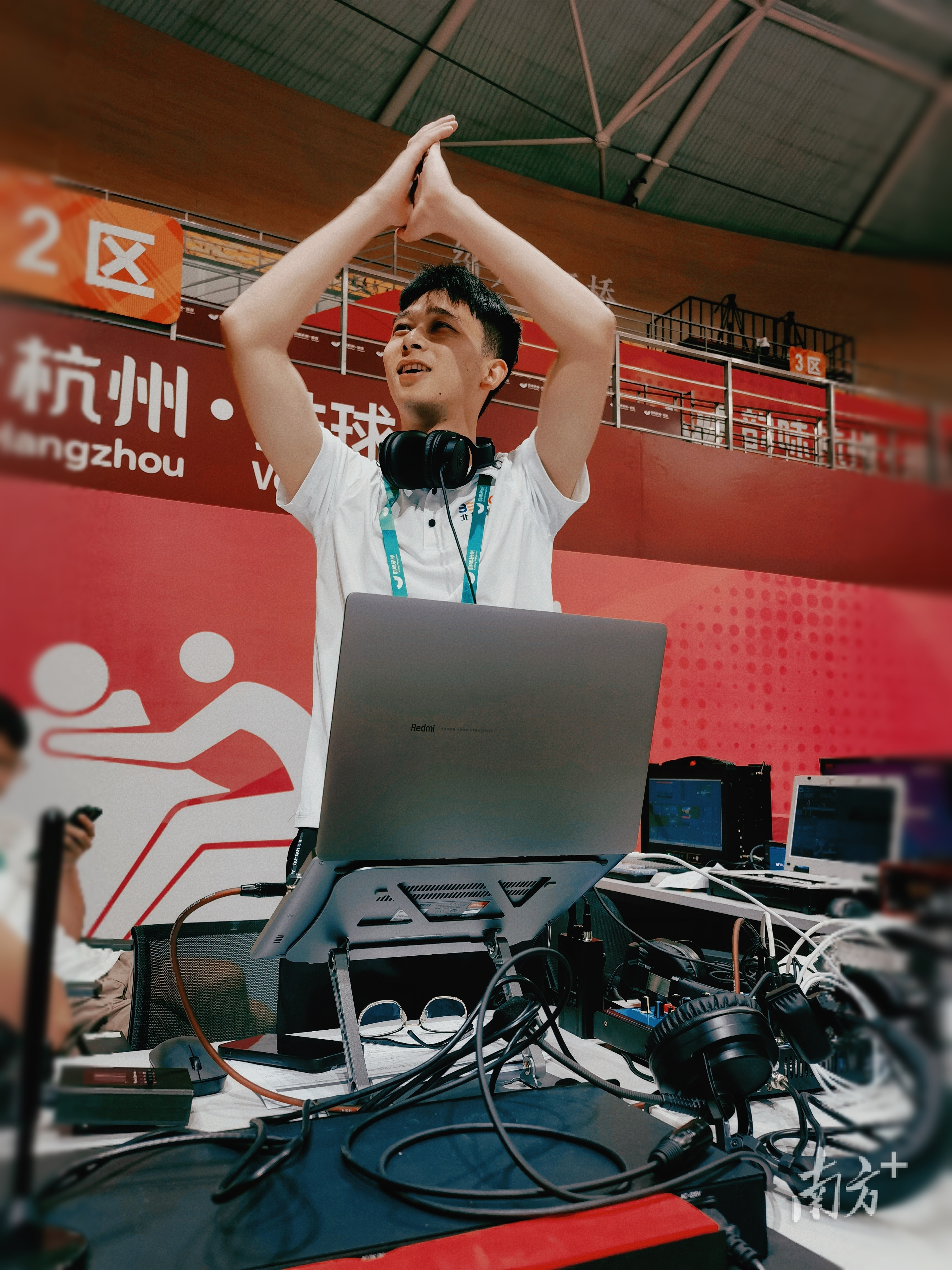 这些BGM的背后,有大量的体育赛事服务团队在做支撑。“主要任务就是搞气氛,把场子热起来,让观众有更好的观赛体验。”杭州亚运会男子排球项目体育展示导演丁斯妤向记者揭秘在赛场“当DJ”的日常。