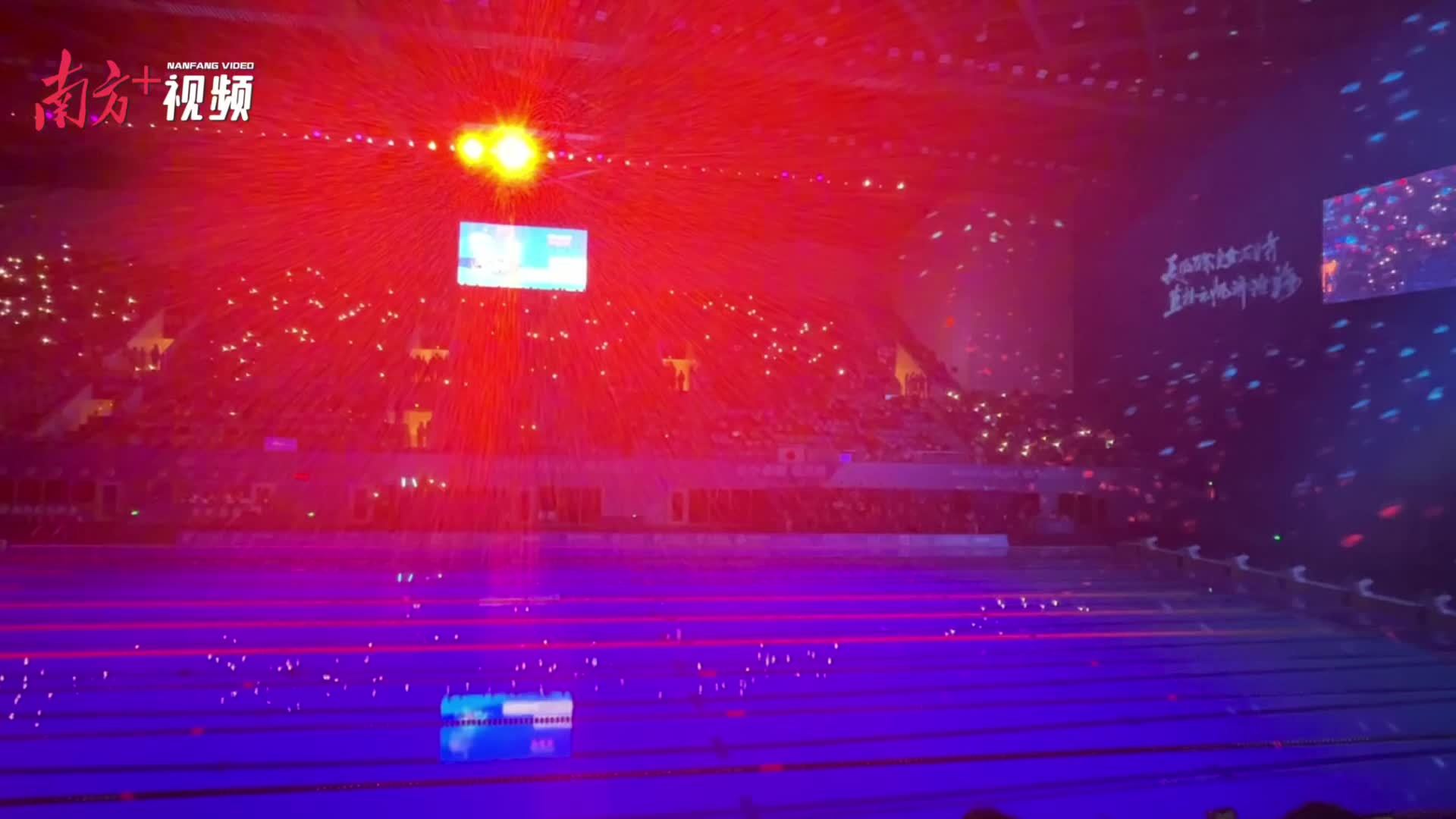 彩色灯光打在泛着波纹的泳池水面和看台上,几位年轻人手中举着荧光棒,在池边的DJ控制台上齐刷刷地挥舞手臂,带动全场观众打开手机闪光灯,汇成一片浪漫光海。《千年等一回》《沧海一声笑》等BGM随之响起,引发全场KTV大合唱。