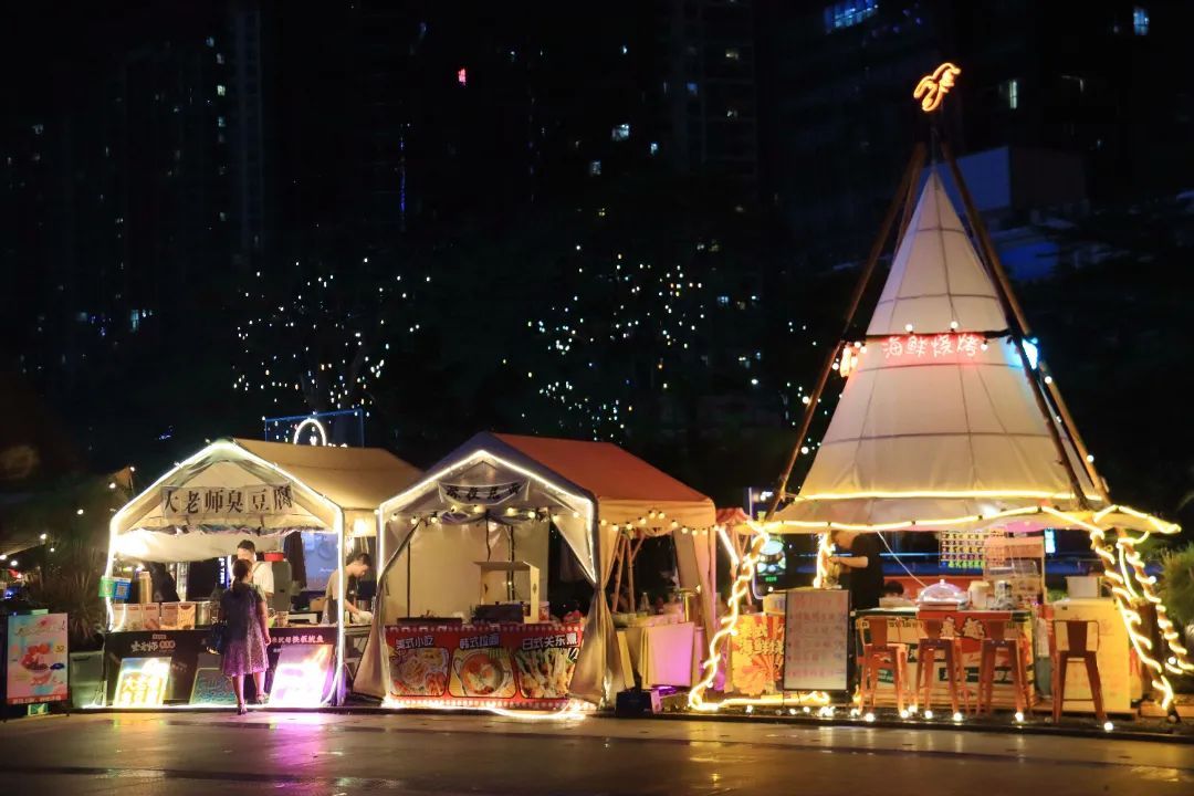 从人头攒动的“清平墟市”一路逛下来,手里满当当地拿着美食。来到天幕下悠闲地品美食、赏夜景,便是快意人生。