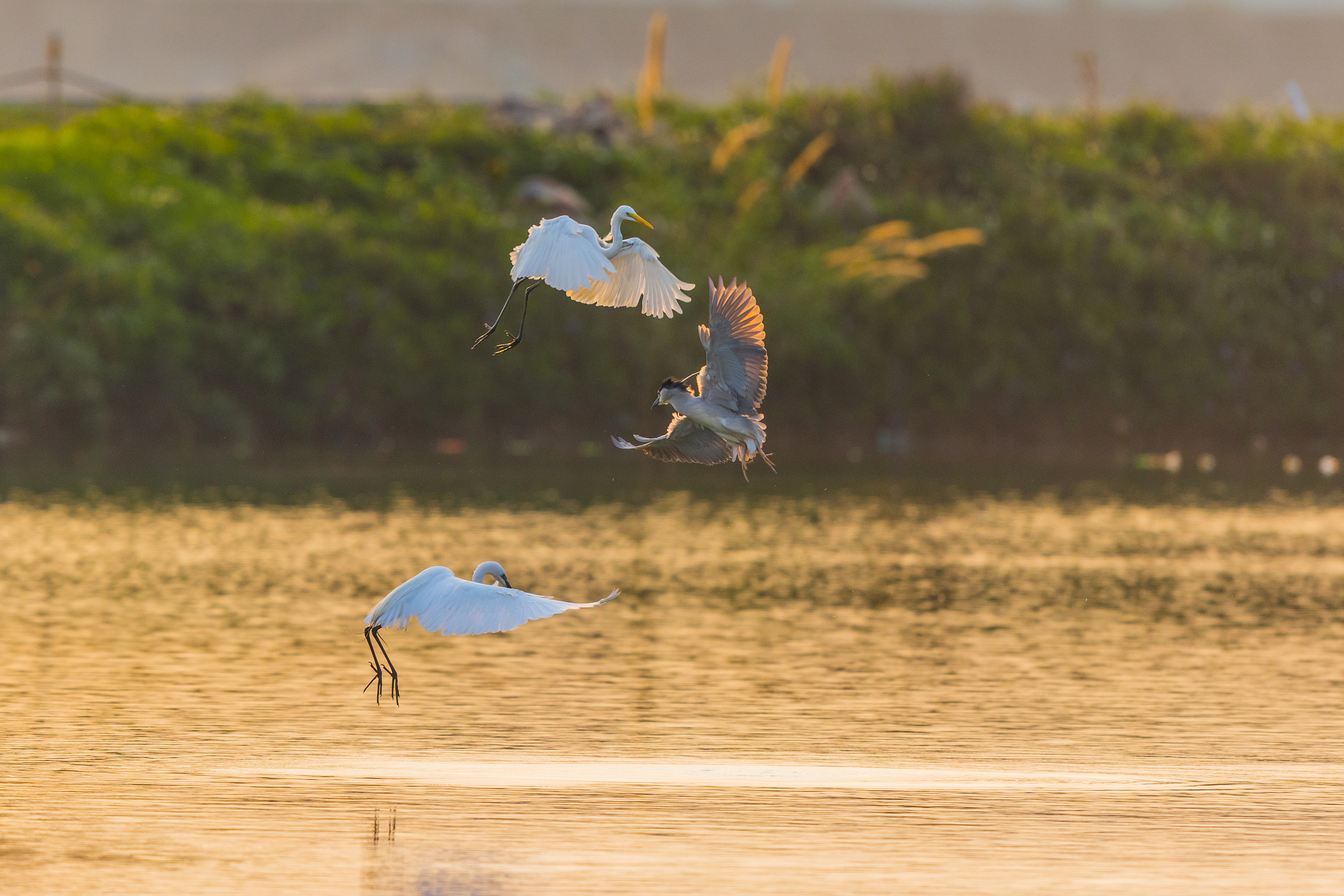 白鹭、夜鹭、小白鹭在空中抢夺捕鱼的最佳位置