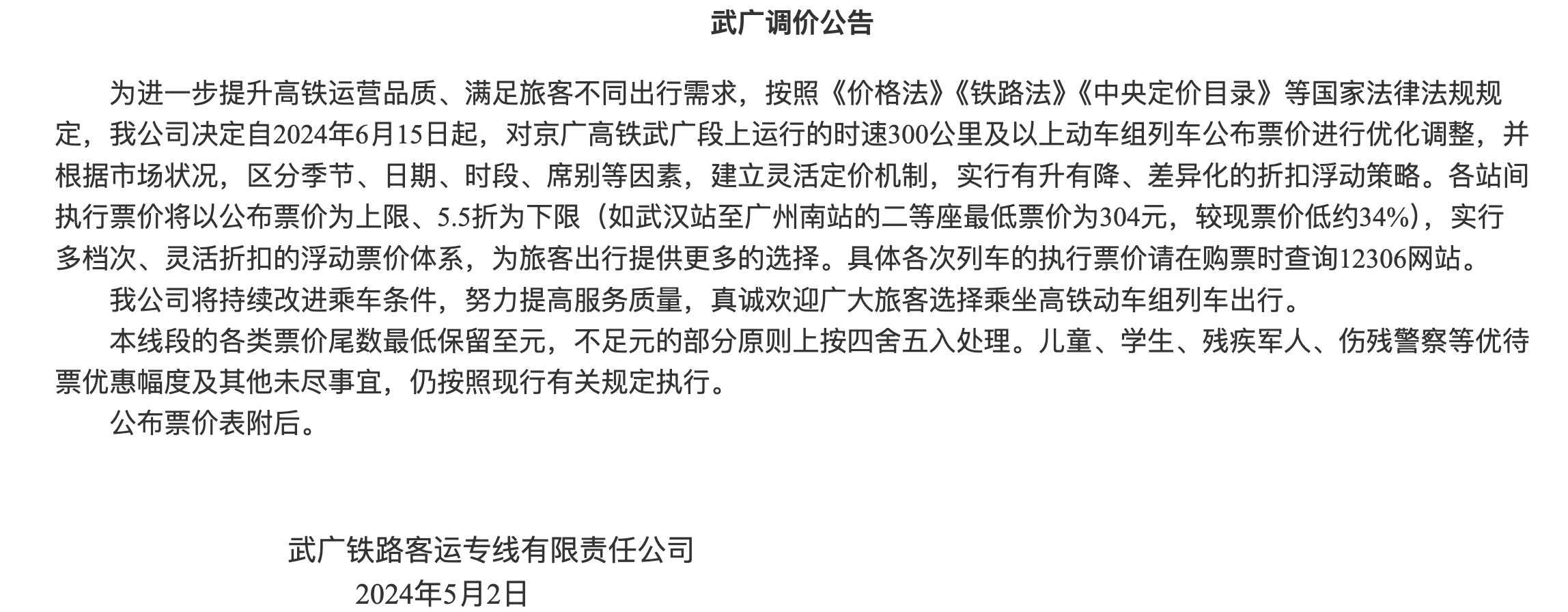 近日,铁路12306官网发布四则调价公告。公告指出,为进一步提升高铁运营品质、满足旅客不同出行需求,决定自2024年6月15日起,对京广高铁武广段、沪昆高铁沪杭段、沪昆高铁杭长段、杭深铁路杭甬段上运行的时速300公里及以上动车组列车公布票价进行优化调整,并根据市场状况,区分季节、日期、时段、席别等因素,建立灵活定价机制,实行有升有降、差异化的折扣浮动策略。