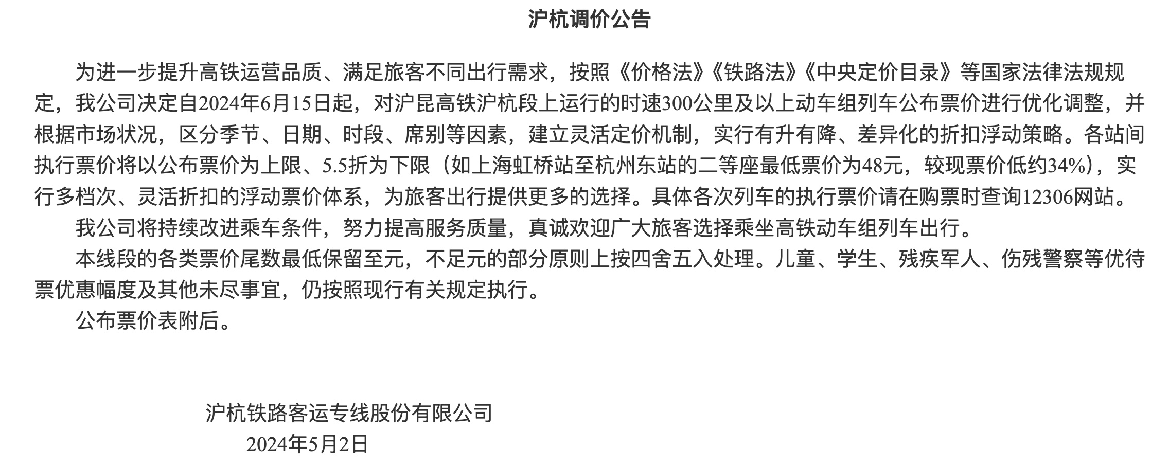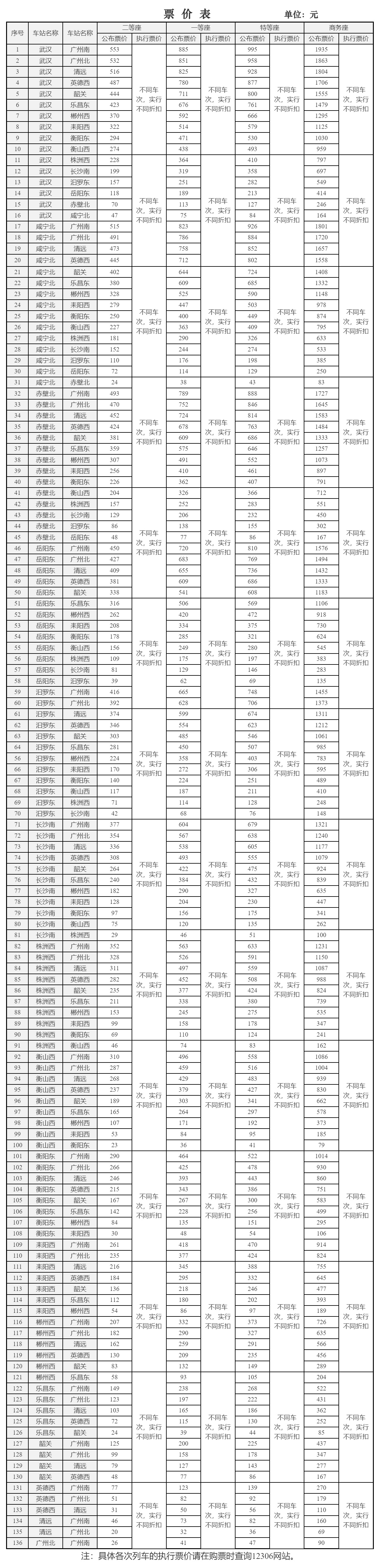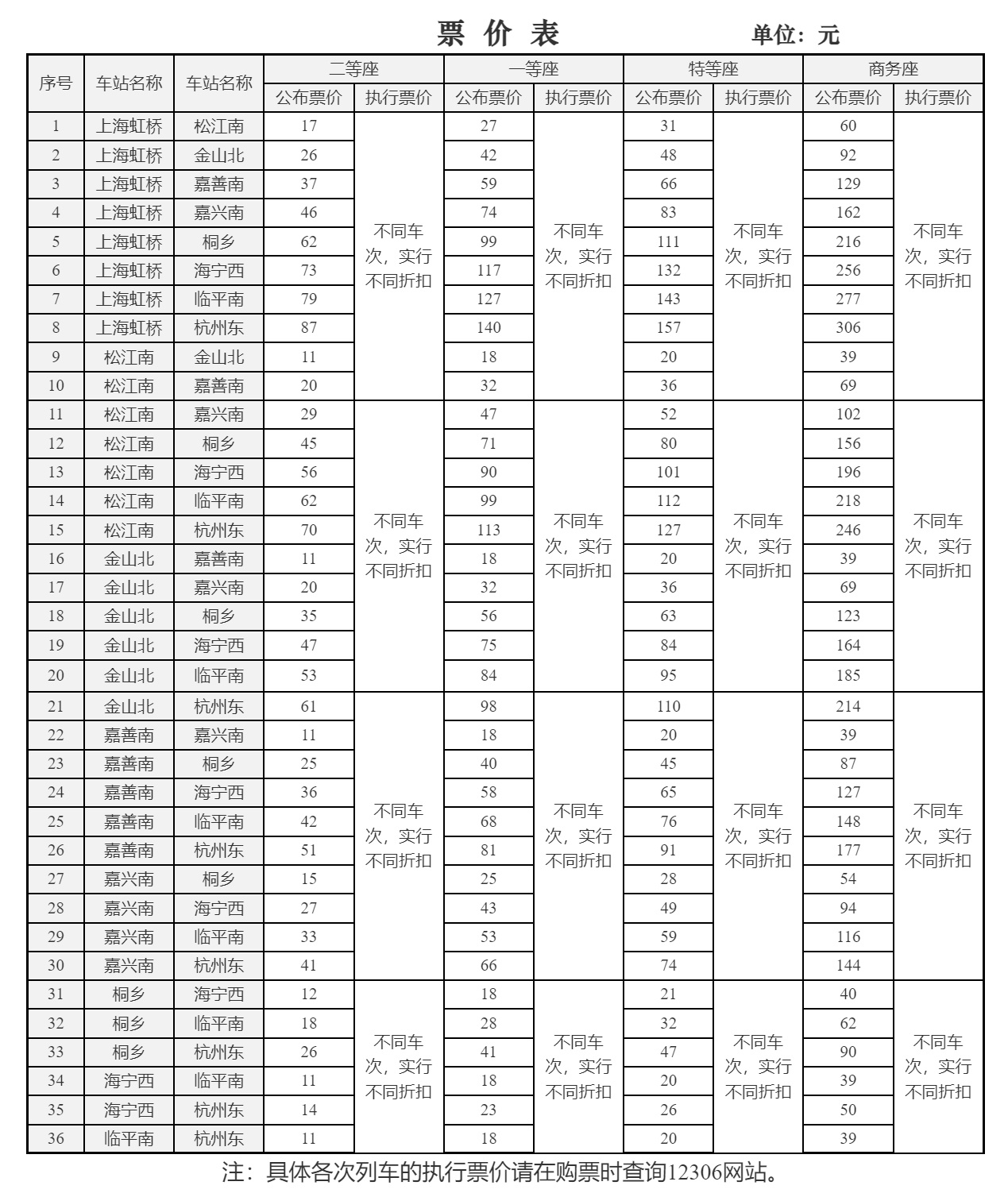 上述四则公告均指出,各站间执行票价将以公布票价为上限、5.5折为下限实行多档次、灵活折扣的浮动票价体系,为旅客出行提供更多的选择。具体各次列车的执行票价请在购票时查询12306网站。