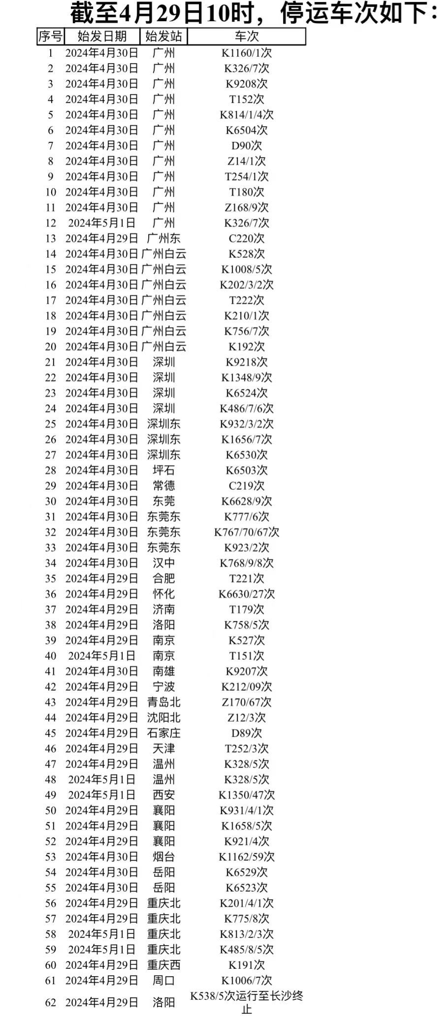 据广铁集团4月29日12时通报,根据气象部门消息,近期湖南大部、广东中北部将出现较大范围的大到暴雨,将对铁路运输秩序造成一定的不利影响。广铁集团始终坚持“人民至上、生命至上”原则,以确保列车和旅客的安全为出发点,根据降雨影响范围,精准研判,主动避险,于4月29日至5月1日期间计划停运京广铁路普速列车62列(具体车次附后),京广、京九普铁和京广高铁的部分列车将出现不同程度晚点。