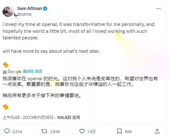 OpenAI创始人山姆·奥特曼在社交平台表示,“我很喜欢在OpenAI的时光,这对我个人来说是变革性的,也希望能为这个世界带来一点变革。最重要的是,我喜欢与这些才华横溢的人一起工作。稍后会说明更多情况。”