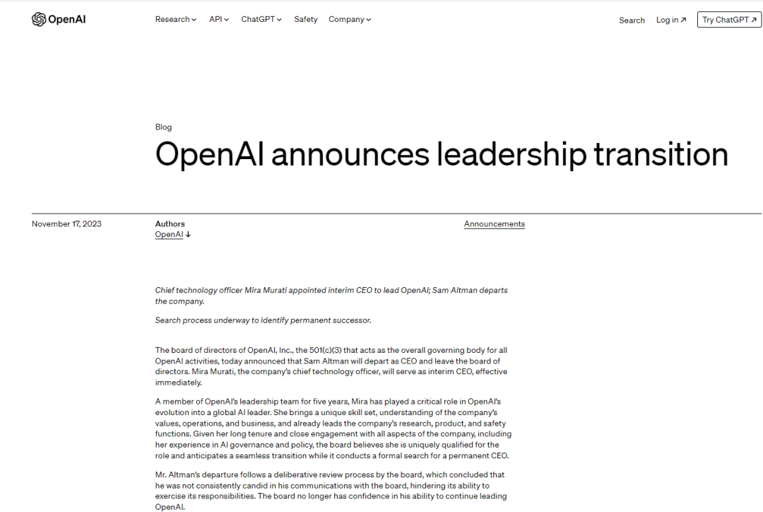 OpenAI官网宣布,创始人兼CEO山姆·奥特曼(Sam Altman)离开OpenAI,首席技术官(CTO)Mira Murati担任临时CEO,该人事变动即日生效。