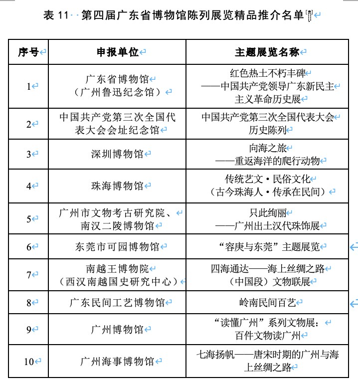 入选的展览分别为广东省博物馆(广州鲁迅纪念馆)“年画里的中国”,广东革命历史博物馆“红色热土·英雄广州——广州革命历史陈列(1840—1949)”,南越王博物院“字里春秋——南越国时期文字文物特展”,广东民间工艺博物馆与广州市文化馆联合申报的“‘一带一路’背景下的广作华章——从外贸商品到非遗保护”。