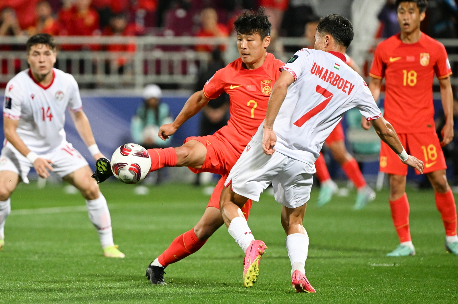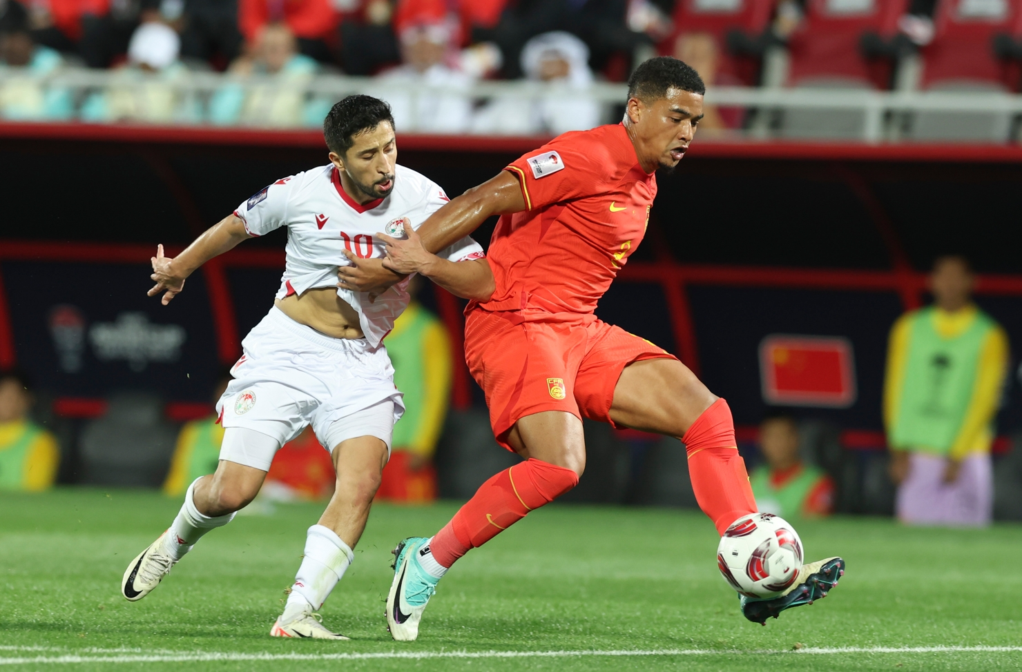 1月13日,中国队对阵塔吉克斯坦队,中国队球员蒋光太(右)与塔吉克斯坦队球员贾利洛夫在比赛中拼抢。新华社发