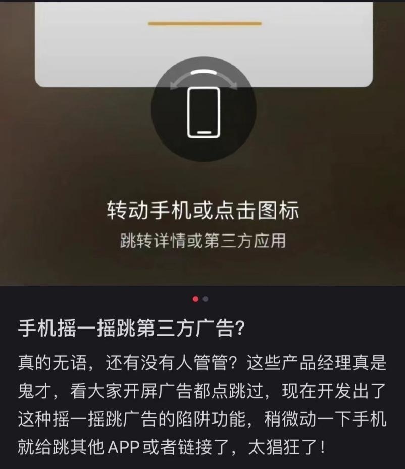 比如,“摇一摇”广告,用户至少得转动手机35°,转3s以上才能跳转;广告上要有明显的“跳过/关闭”按钮、“点击跳转第三方”的标识;点击特定区域才能跳转;不能误导、诱导用户操作;不能频繁弹出广告;广告要能一键关闭等等。