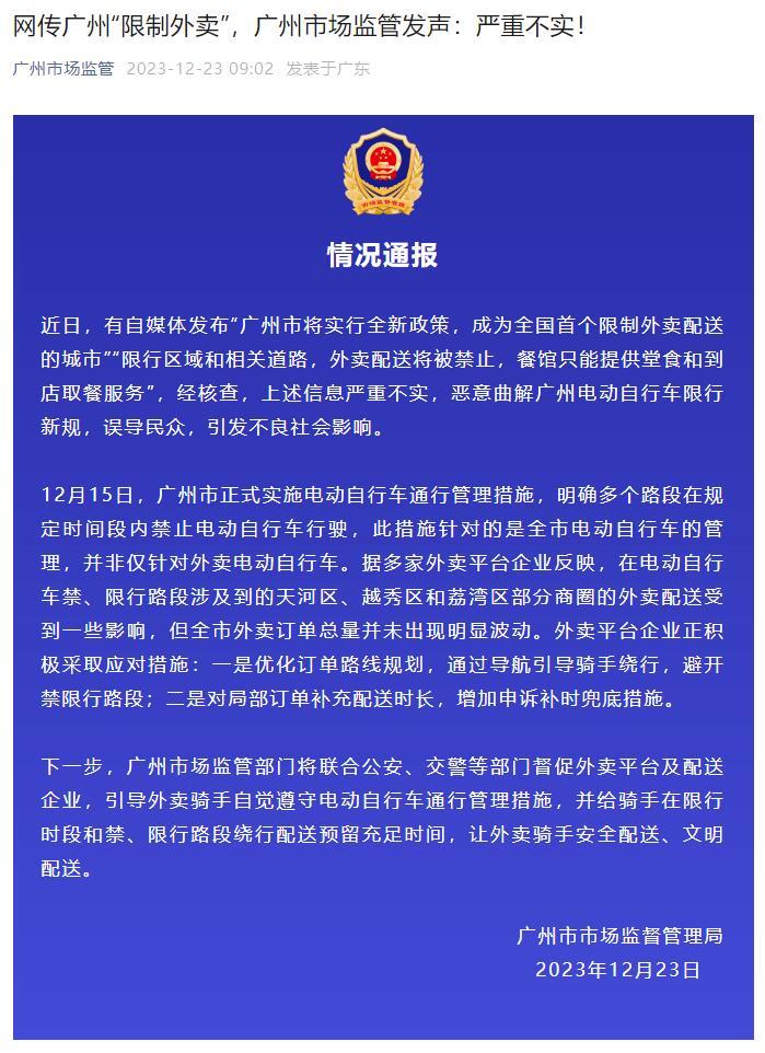 近日,有自媒体发布“广州市将实行全新政策,成为全国首个限制外卖配送的城市”“限行区域和相关道路,外卖配送将被禁止,餐馆只能提供堂食和到店取餐服务”。12月23日,广州市市场监督管理局发布情况通报,详情如下: