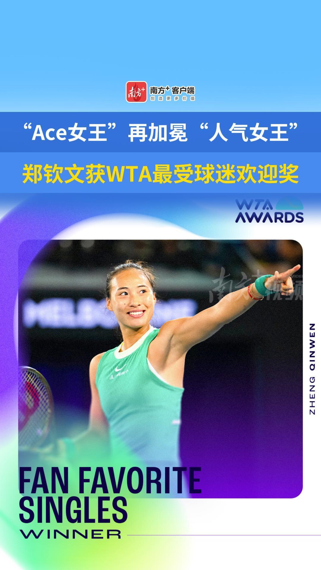 “Ace女王”再加冕“人气女王”!郑钦文获WTA最受球迷欢迎奖
