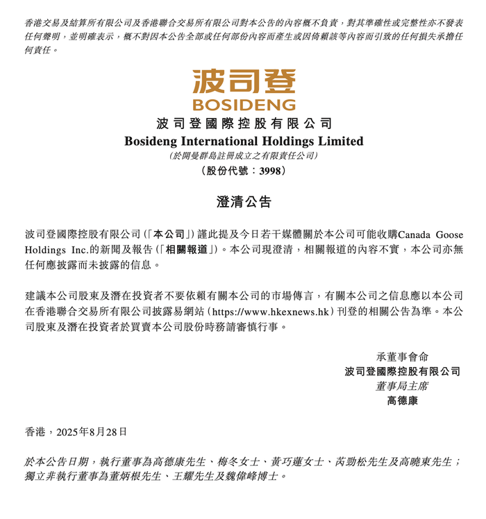 8月29日,波司登在港交所公告,公司谨此提及今日若干媒体关于本公司可能收购Canada Goose Holdings Inc.的相关报道。本公司现澄清,相关报道的内容不实,公司亦无任何应披露而未披露的信息。 编辑 宋佳宁 订阅后可查看全文(剩余80%)