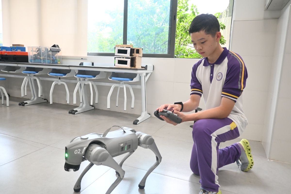前进、转身、跳跃,9月19日,在东莞市南城商务区北部学校二楼科创室内,812班林泽航同学正熟练地遥控着电子狗,随着他操控的指尖轻动,科技感十足的电子狗便应声而起,每一个动作行云流水,仿佛被赋予了生命。这看似轻松的指令背后,是无数个小时的调试与打磨,也是林泽航日常科创实践的缩影。