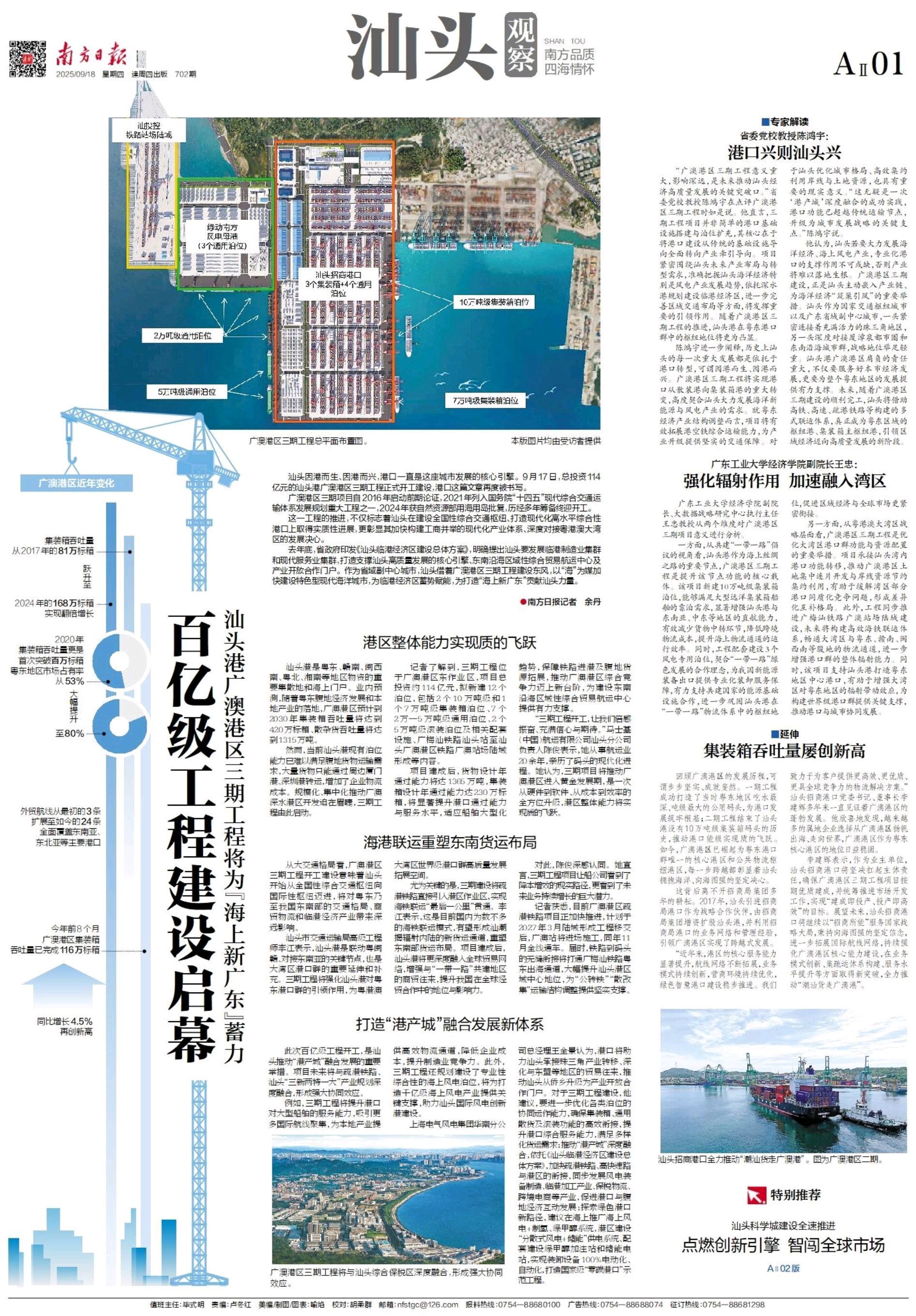 汕头市交通运输局高级工程师李江表示,汕头港是联动粤闽赣、对接东南亚的关键节点,也是大湾区港口群的重要延伸和补充。三期工程将强化汕头港对粤东港口群的引领作用,为粤港澳大湾区世界级港口群高质量发展拓展空间。
