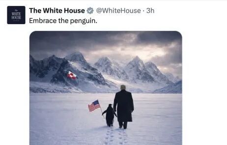 白宫发布特朗普牵着企鹅在格陵兰岛漫步的图片。