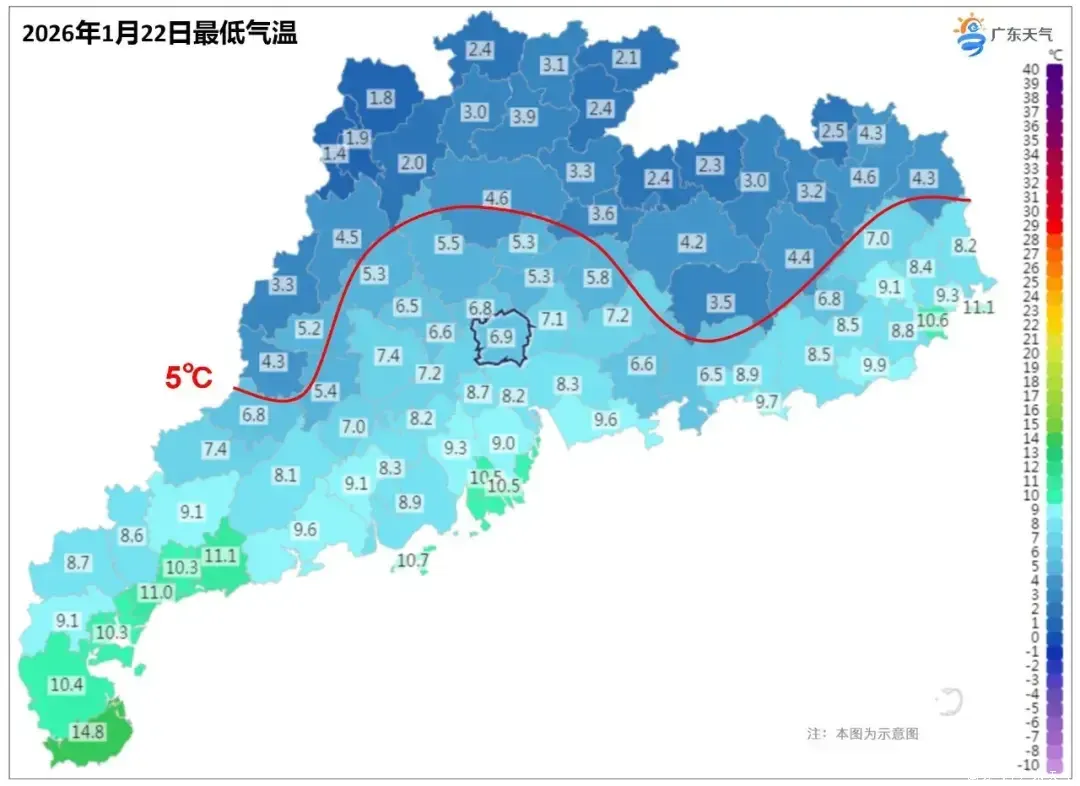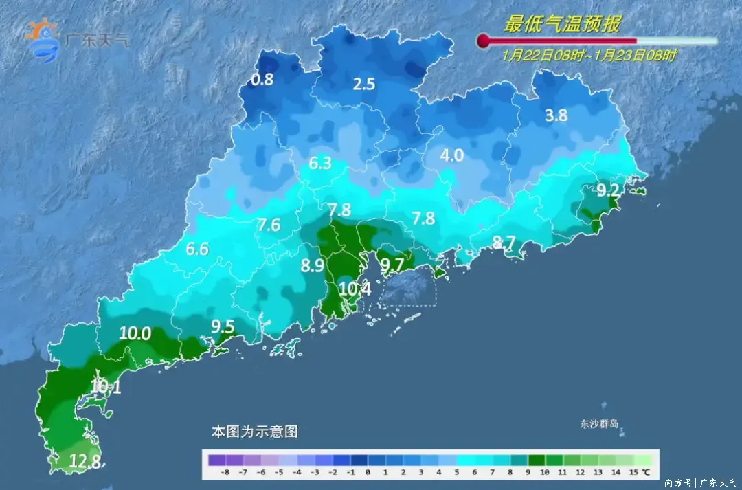 受冷空气影响,今天(22日)早晨,粤北大部和肇庆北部市县出现了1~5℃的低温天气,最低气温:雷州半岛10~15℃,南部市县8~10℃,其余市县5~8℃,其中清远连山1.4℃、广州6.9℃,连州南风坳录得高海拔山区最低气温-5.9℃。