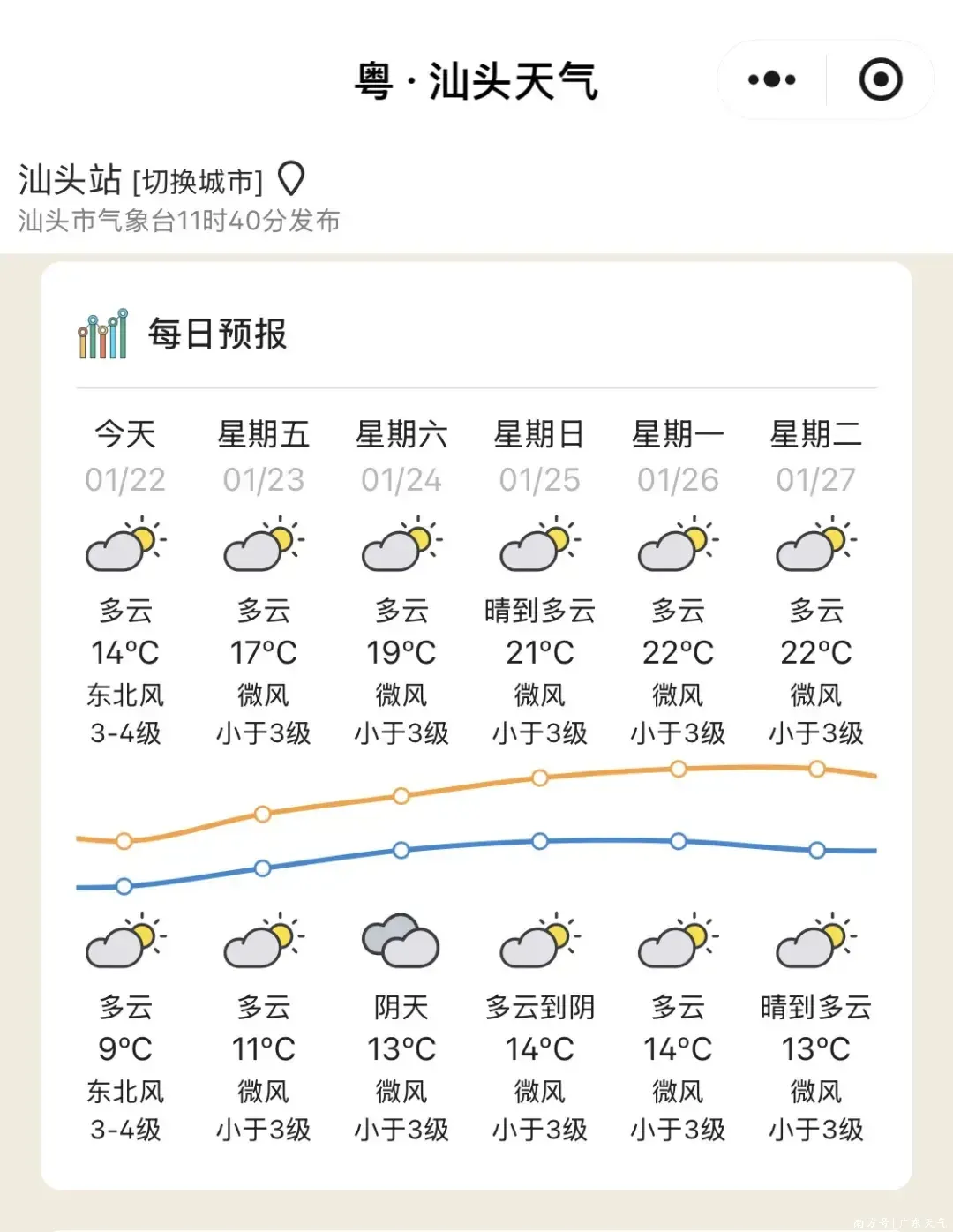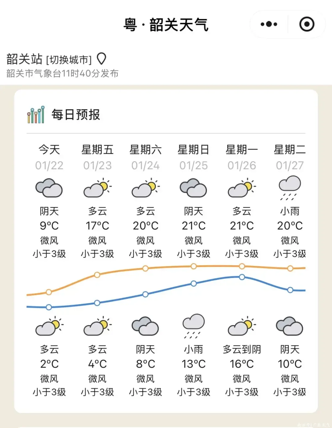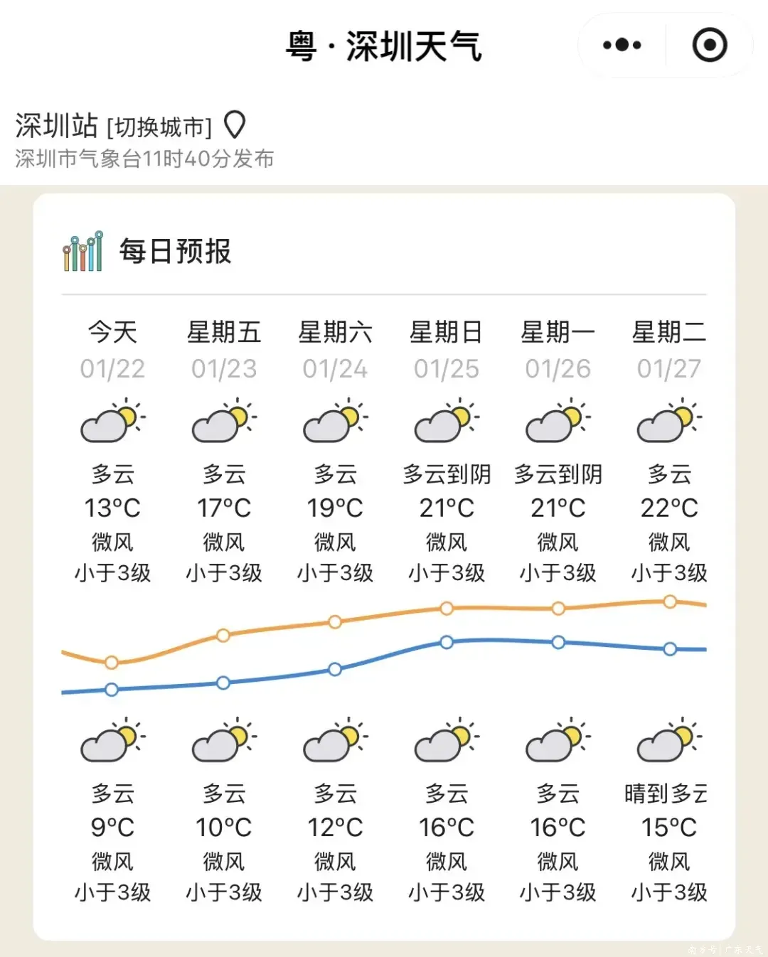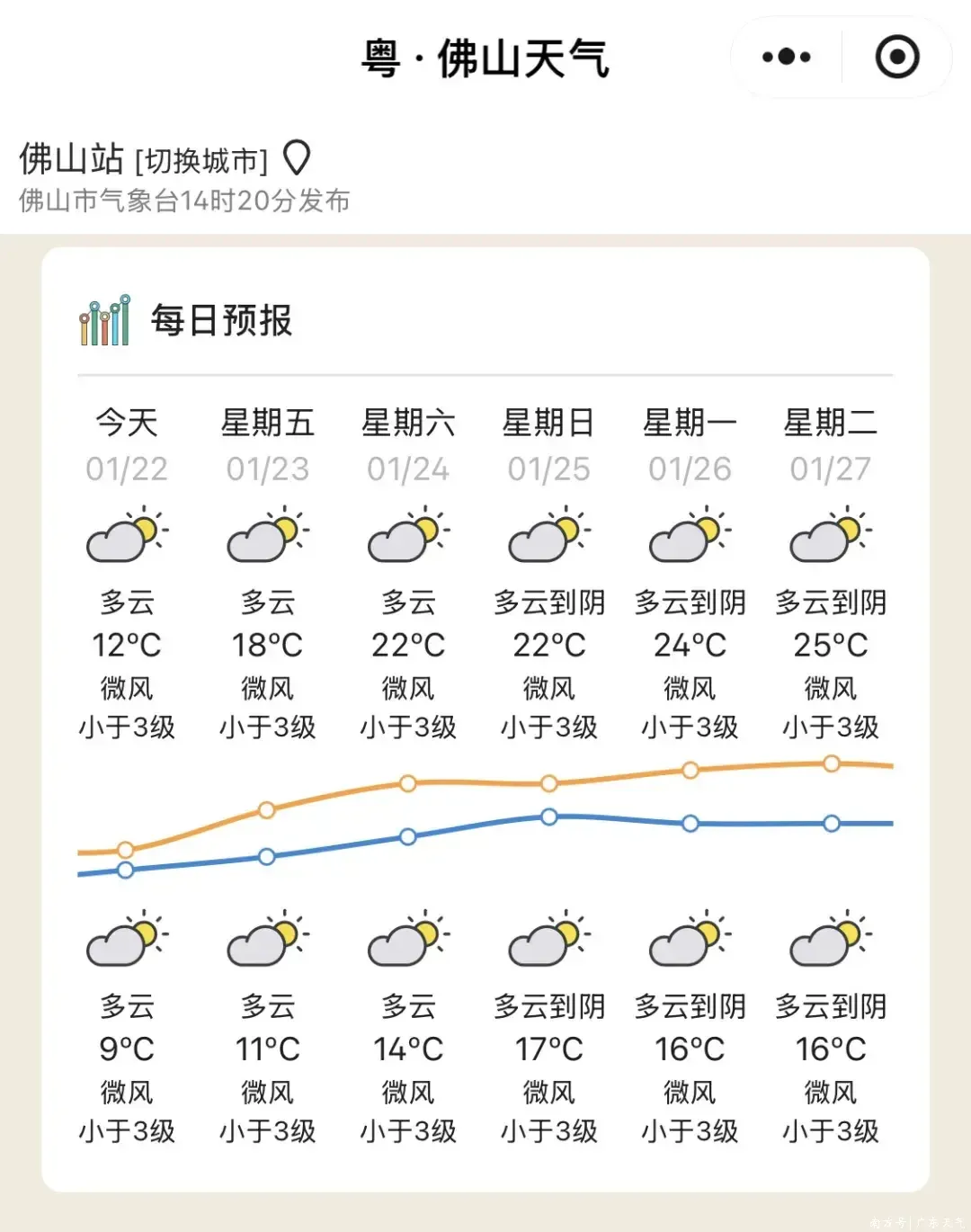 25日(周日),雷州半岛多云,其余大部市县阴天间多云,有小雨。早晚大部市县有轻雾或雾。最低气温:粤北市县7~10℃,雷州半岛市县14~18℃,其余市县10~13℃。