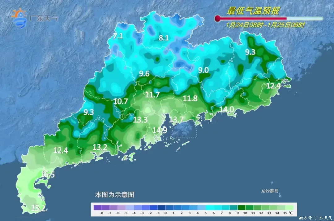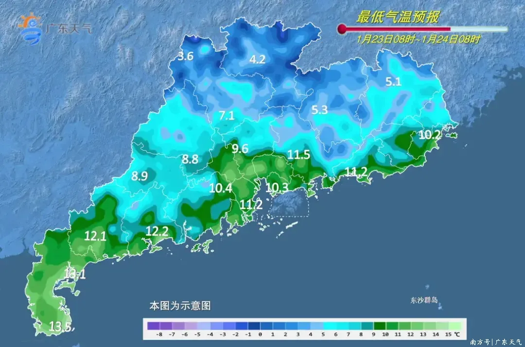 具体来看,23日,粤西和珠江三角洲西部市县多云间阴天,其余市县晴到多云,早晚部分市县有轻雾。最低气温:粤北偏北市县1~3℃,粤北偏南市县、珠江三角洲北部市县、粤东的北部市县3~6℃,粤北的高海拔山区-3~1℃,有冰(霜)冻,粤西市县10~14℃,其余市县6~10℃。