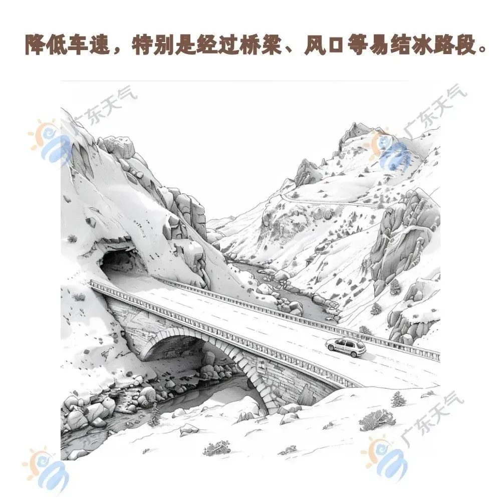 另外需要注意的是,粤北高海拔山区局部有道路结冰,驾车时请注意降低车速、加大车距。行人尽量选择有防滑措施或已清理的道路行走,避开光滑冰面。