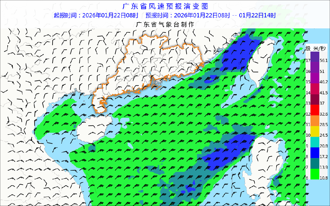 海上大风预报:22日,粤东海面东北风6~7级阵风8级,中西部海面东北到东风6级阵风7级,台湾海峡、巴士海峡、南海东北部海面东北风7级阵风8级;23日,广东海面东北风减弱到5~6级阵风7级,台湾海峡、巴士海峡、南海东北部海面东北风6~7级阵风8级,注意海上交通和作业安全。