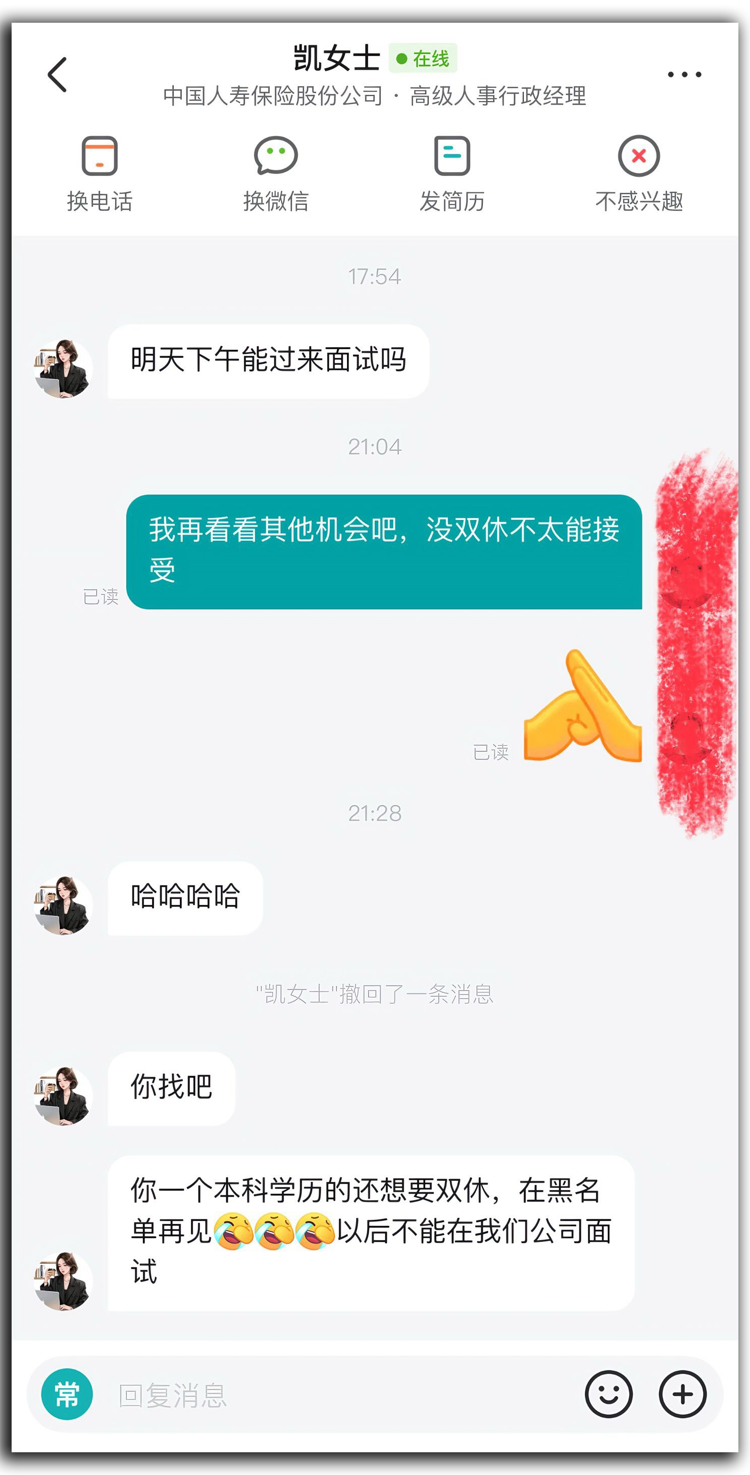 1月18日,一名求职者在BOSS直聘与中国人寿相关岗位人事沟通时,提出“没有双休不太能接受”的个人诉求,随即遭到对方情绪化回应:“本科学历还想找双休,在黑名单里见,以后不能在我们公司面试。”