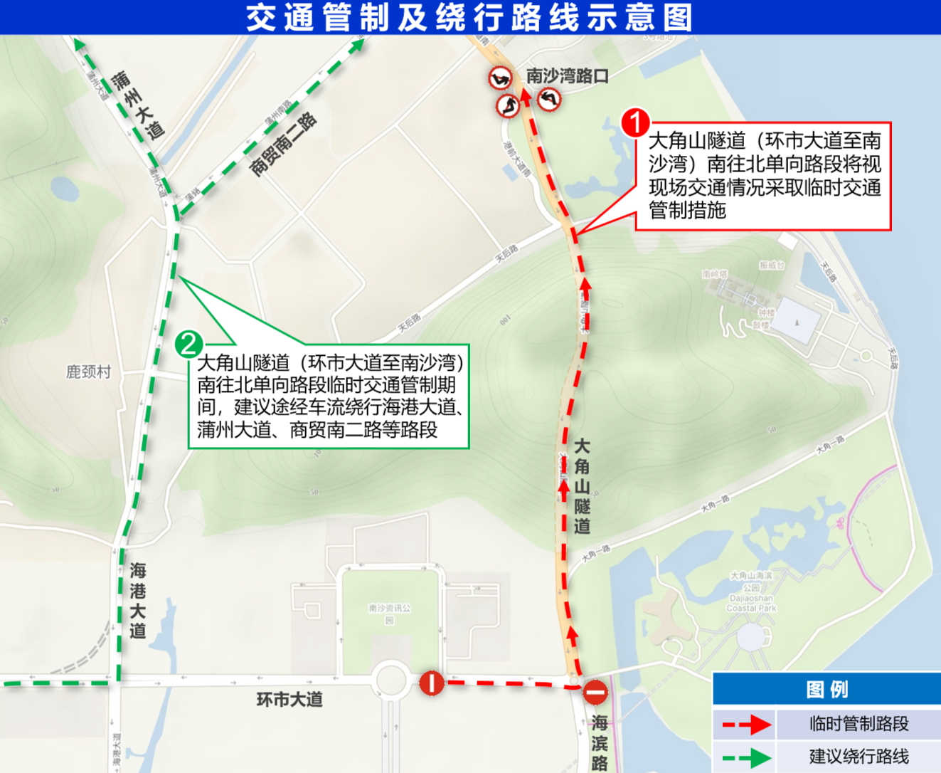 动态管制路段:环市大道南(霍英东研究院路口至海滨路)西往东方向、大角山隧道(环市大道至南沙湾)南往北方向。