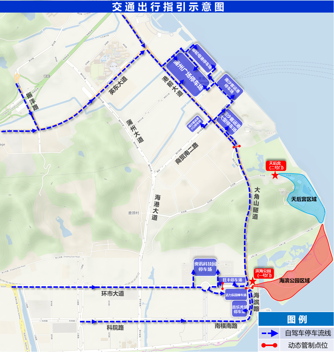 滨海公园(一号门)与天后宫(二号门)周边设置有多个停车场。