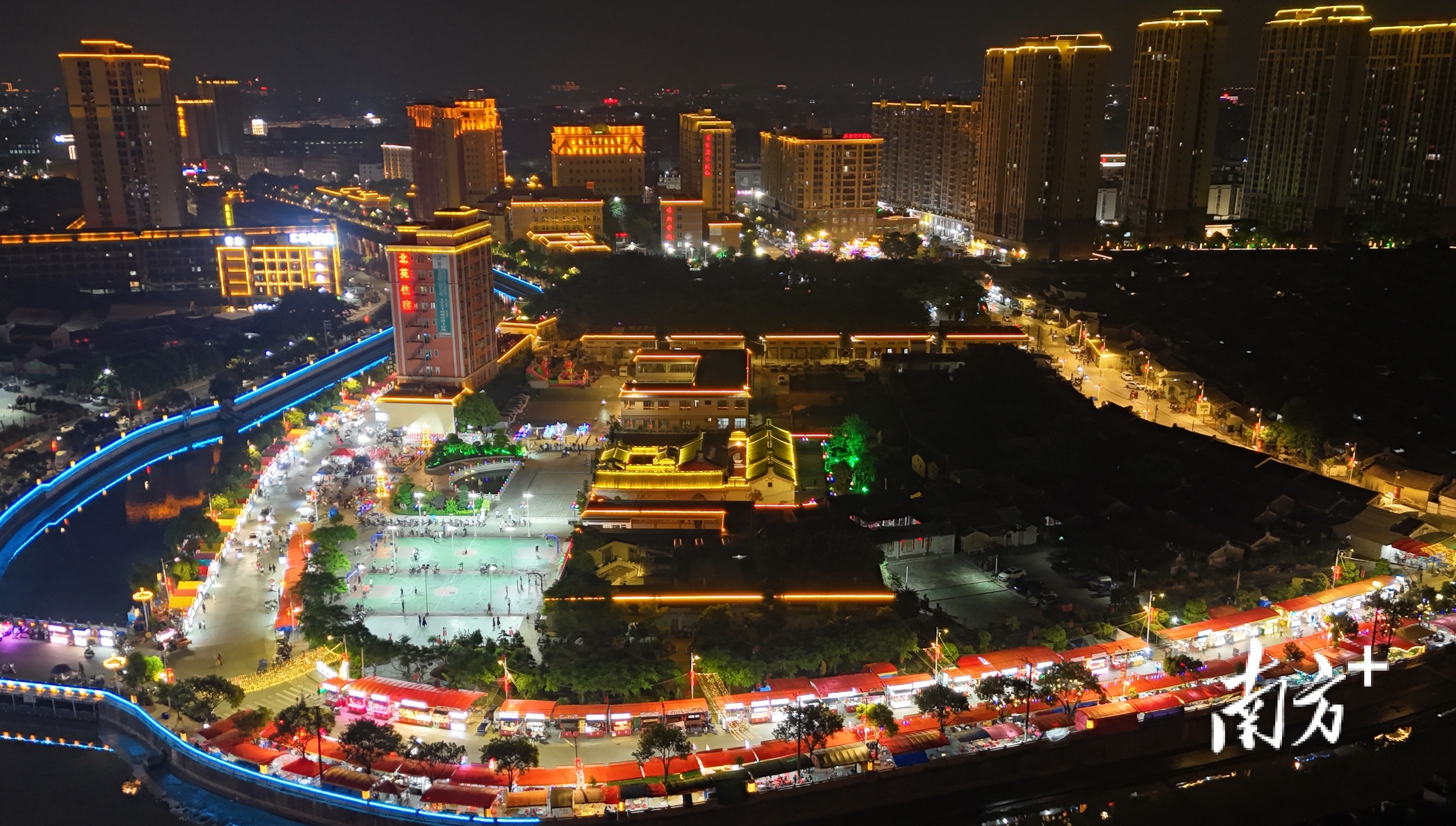 每到夜晚,灯光夜市和两英大溪流光溢彩。