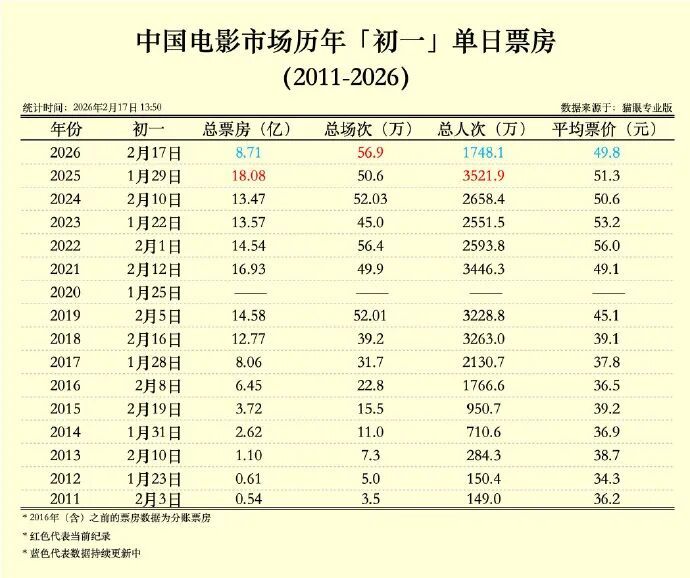据猫眼专业版数据,2026年大年初一单日场次超56.9万,刷新影史大年初一单日场次纪录。截至发稿,2026年春节档新片总票房破11亿,《飞驰人生3》《惊蛰无声》《熊出没·年年有熊》暂列春节档新片票房榜前三位 。 编辑 邓聿修 订阅后可查看全文(剩余80%)