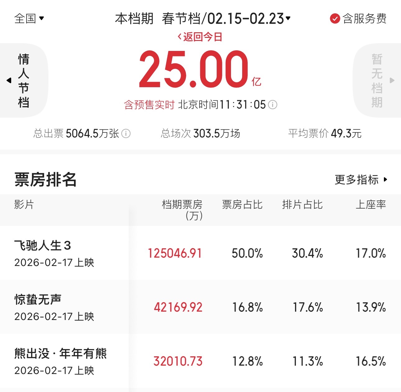 据猫眼专业版数据,2026年春节档总票房(含预售)突破25亿元,《飞驰人生3》《惊蛰无声》《熊出没·年年有熊》分列前三位。广东省春节档期内票房突破2.2亿元,总放映场次超30万,总观影人次超470万,位居全国第二,仅次于江苏省。