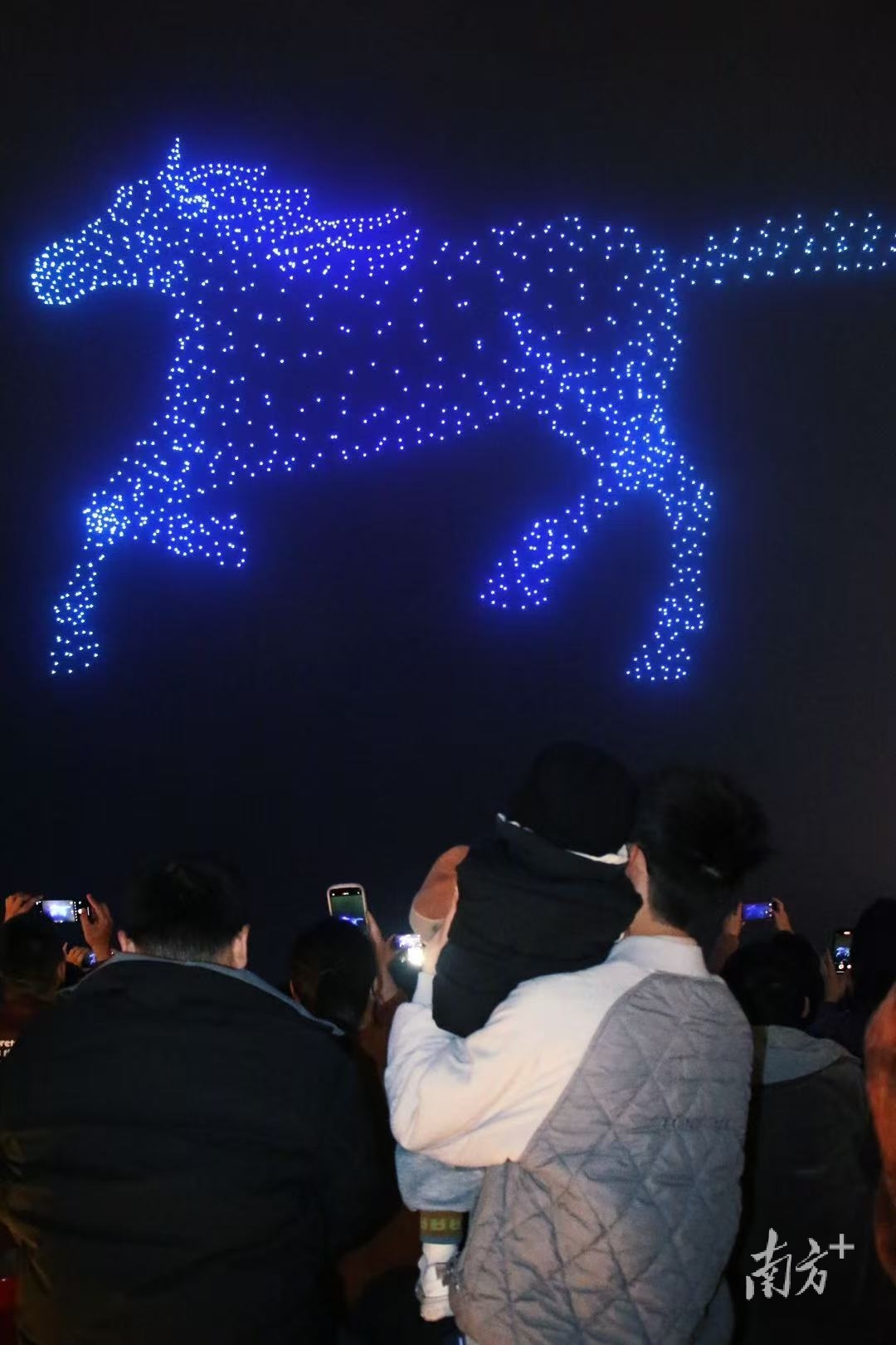 晚8时40分许,随着一阵低沉的嗡鸣声,1300架无人机如璀璨星辰般从品清湖面缓缓升空,仿佛一幅深邃的星图被瞬间点亮,正式拉开无人机表演《汕尾非遗》的帷幕。正字戏、白字戏、西秦戏、陆丰皮影、滚地金龙、麒麟舞、河田高景、甲子英歌、汕尾渔歌等9个国家级非物质文化遗产代表性项目悉数亮相。