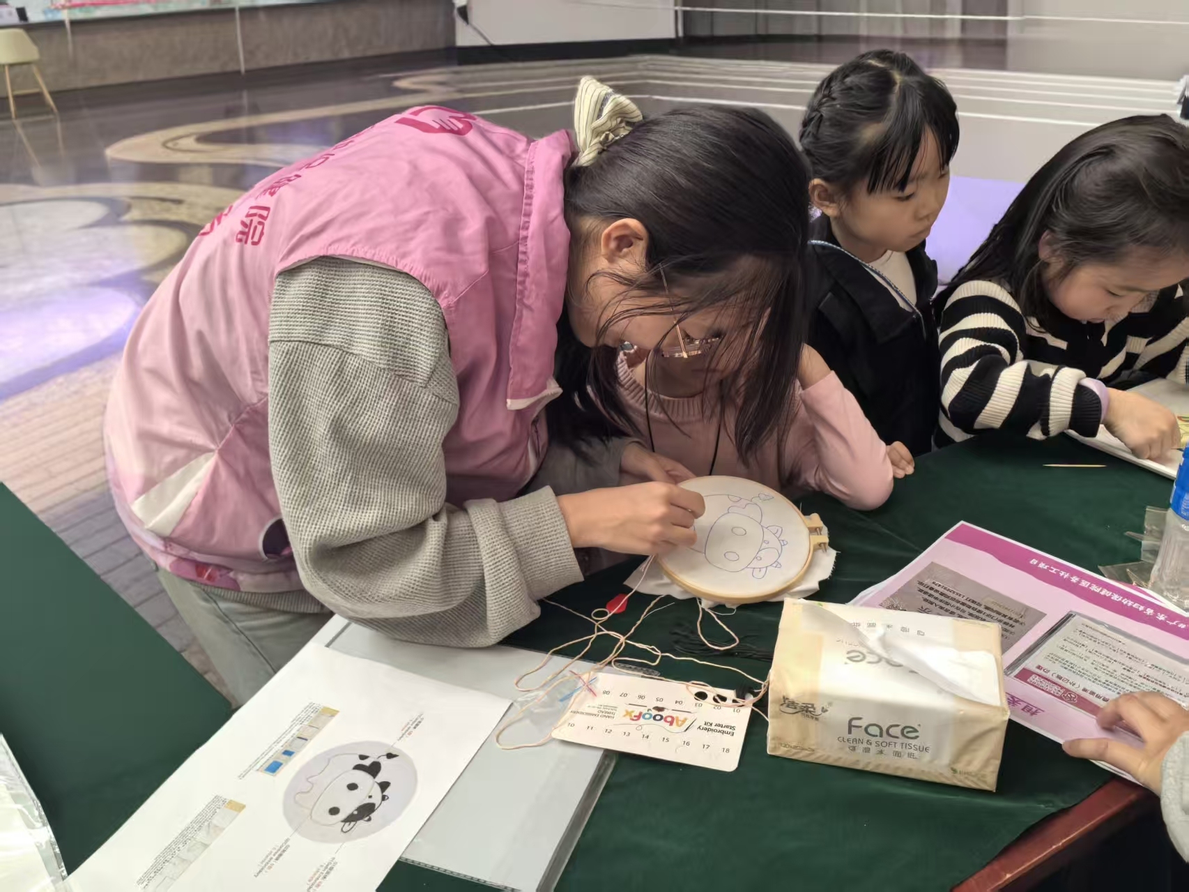 活动现场氛围温馨而有序。在专业广绣团队成员的耐心指导下,患者、家属与医护人员共同了解广绣历史、学习基础针法、认识吉祥纹样寓意。大家围坐在一起,从初始的生疏试探,逐渐到从容运针。丝线在指尖流转,图案于绷架上渐渐清晰,老年患者沉静勾勒,亲子家庭默契协作,成为门诊大厅里一道动人的风景。