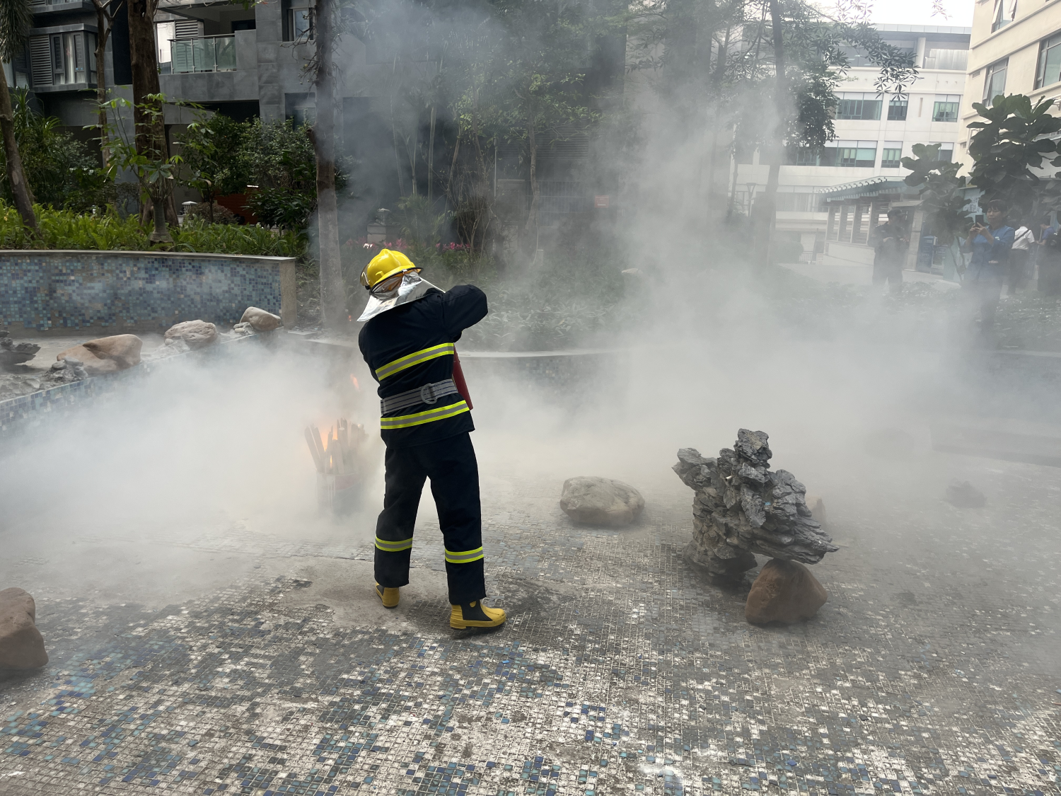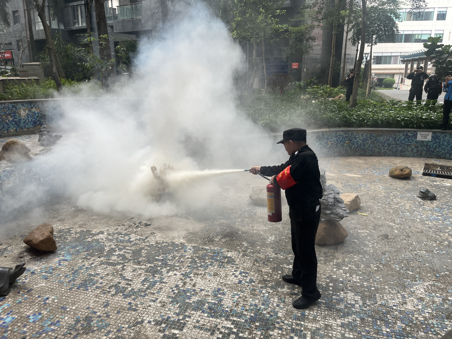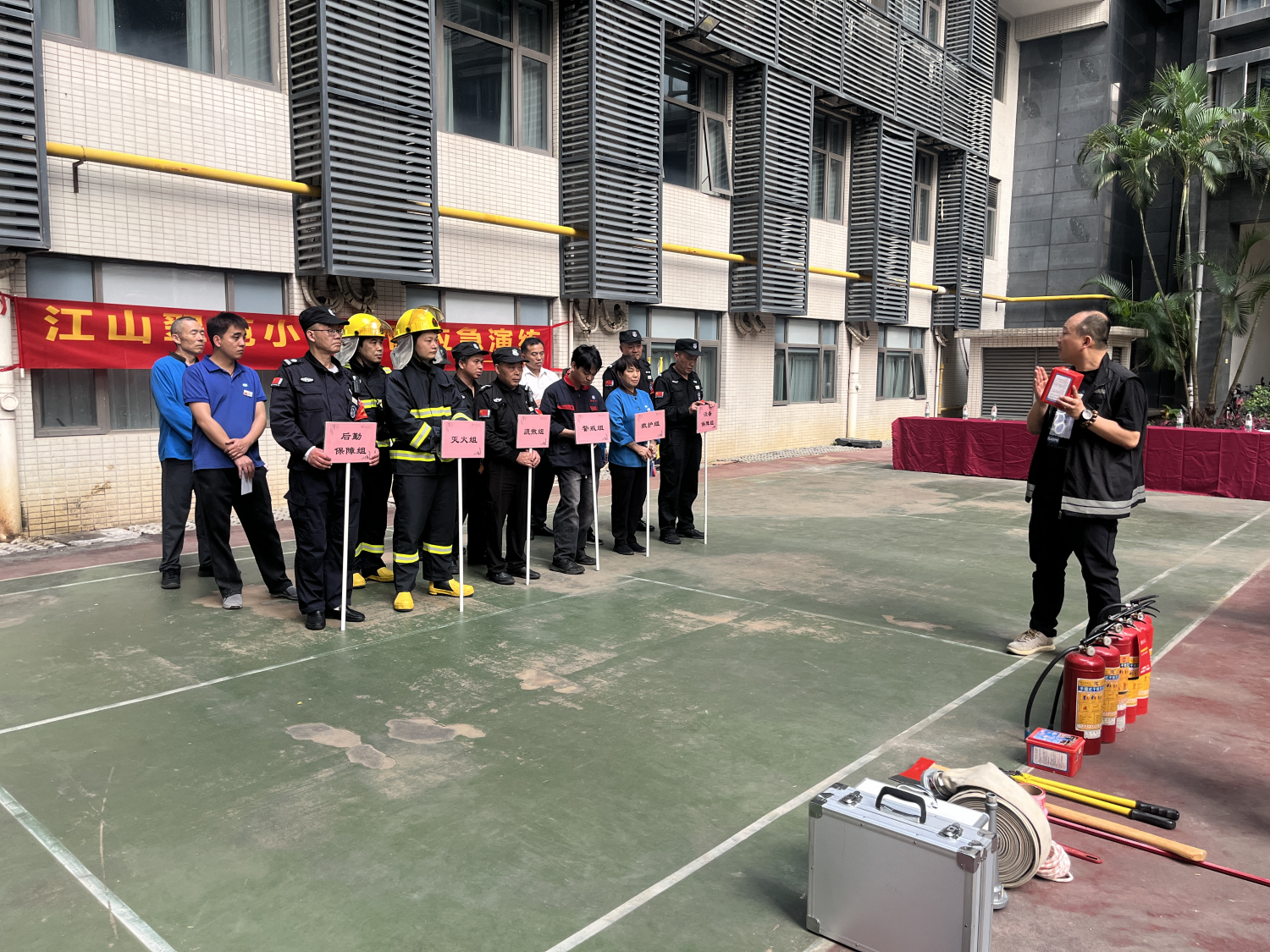 培训结束后,应急演练正式启动。活动现场科学划分疏散引导组、现场警戒组、灭火行动组、医疗救护组、后期保障组、设备保障组六大专项小组,各组人员各司其职、协同配合。演练间隙,应急办及物业公司工作人员还现场演示了灭火器、防烟面具的正确使用方法,组织参与人员逐一实操练习,耐心解答大家提出的各类消防安全问题,确保每一位参与者都能熟练掌握消防器材使用技能。