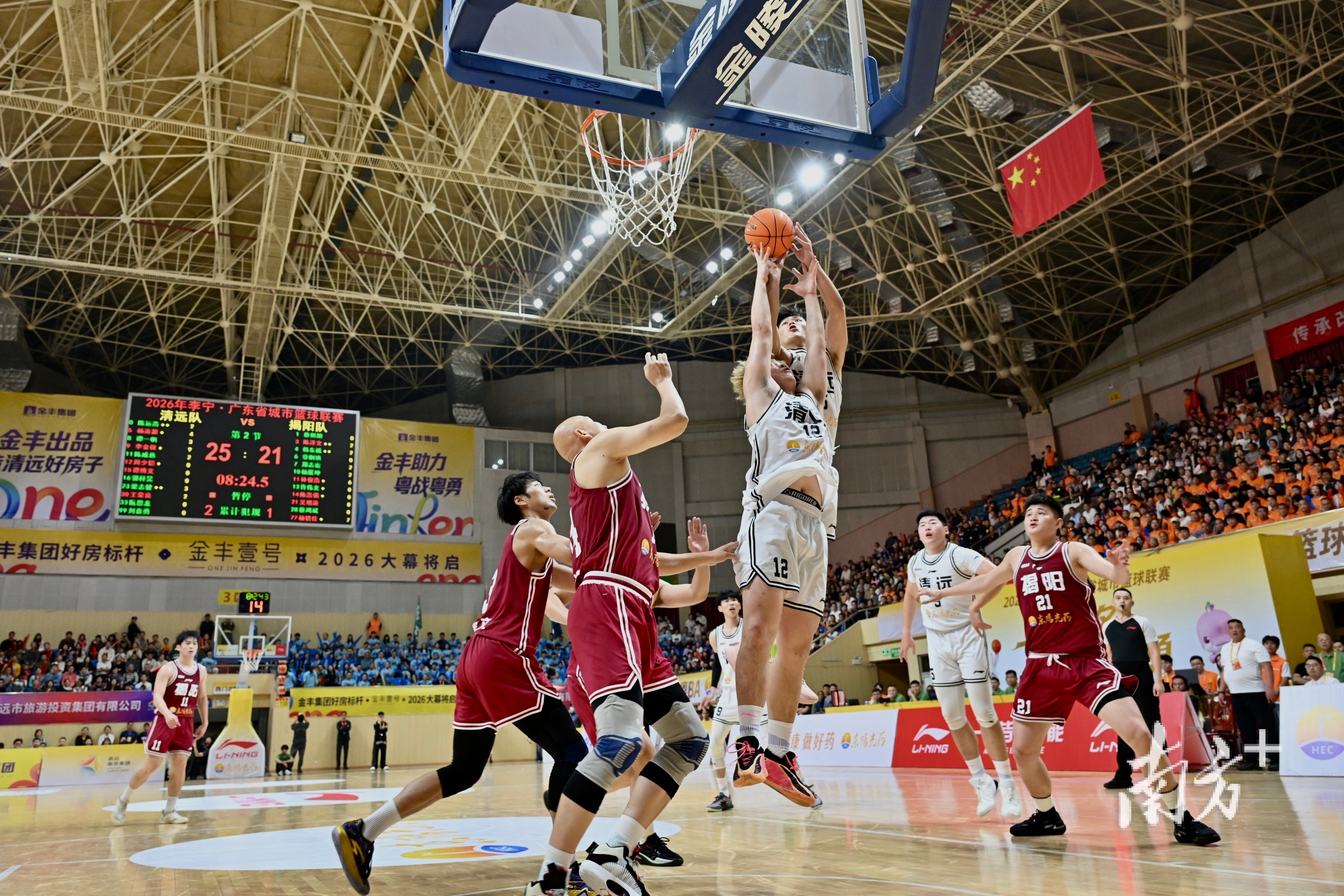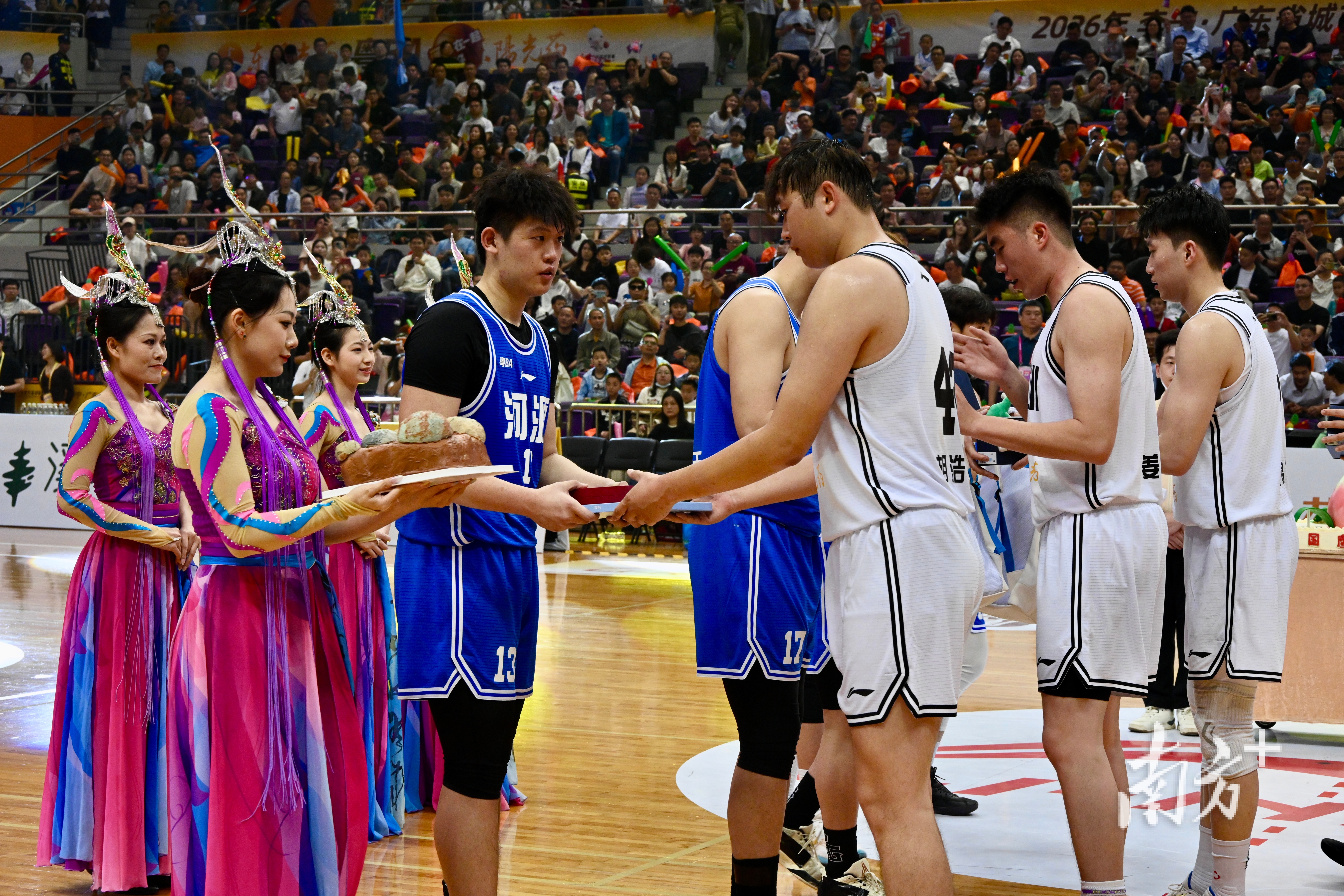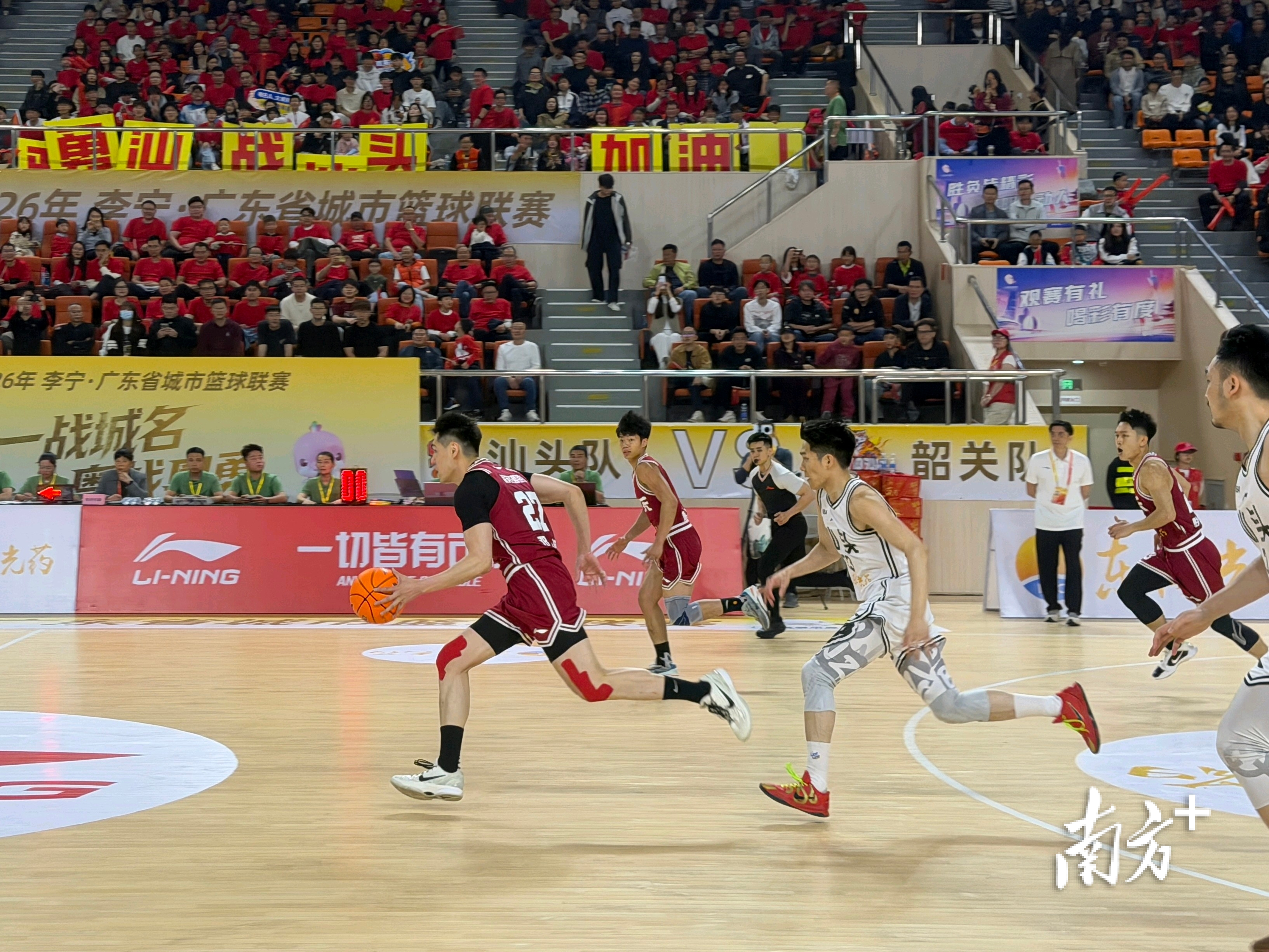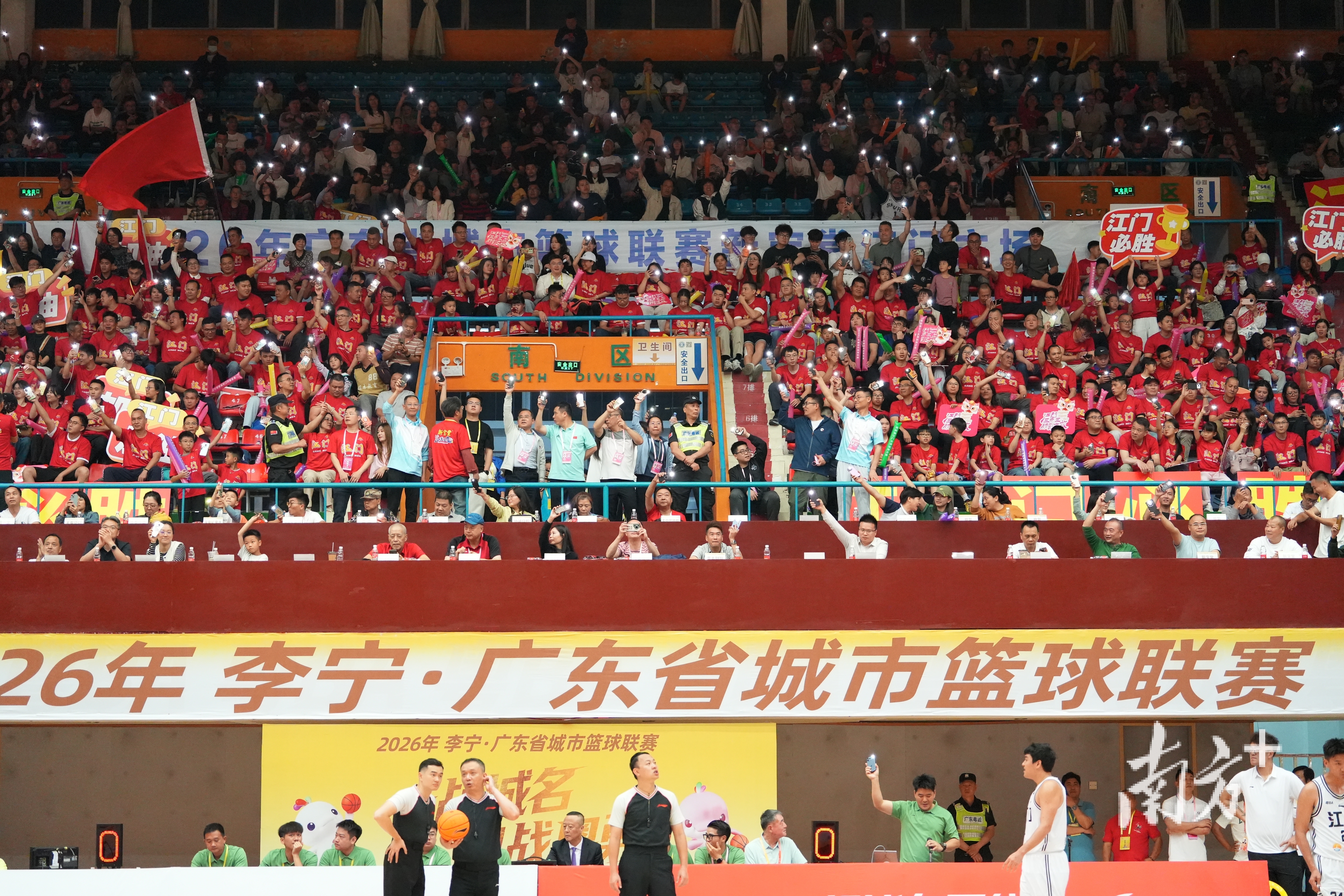 21日晚的粤BA揭幕战,天河体育中心体育馆涌入6000余名观众,全场高唱国歌的场面震撼人心。这并非孤例——在潮州,多处户外LED大屏为赛事亮灯,“一战城名,粤战粤勇”的标语点亮街头;在湛江,醒狮助阵、调顺网龙非遗展示轮番上演,现场2500多名球迷齐声高歌,把球场变成了一片欢乐的海洋;在汕头,近3000名观众挥舞彩旗、横幅、加油棒,呐喊声此起彼伏……从粤东到粤西,从珠三角到粤北,粤BA首轮全省多地同步开打,处处都是热火朝天的景象。