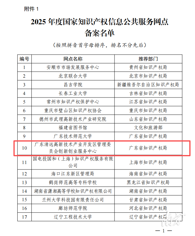笔者从清远高新区获悉,近日,国家知识产权局公布2025年度国家知识产权信息公共服务网点备案名单。清远高新区创新创业服务中心依托清远高新区知识产权协同运营(综合服务)中心出色运营,成功入选成为清远首家国家知识产权信息公共服务网点。