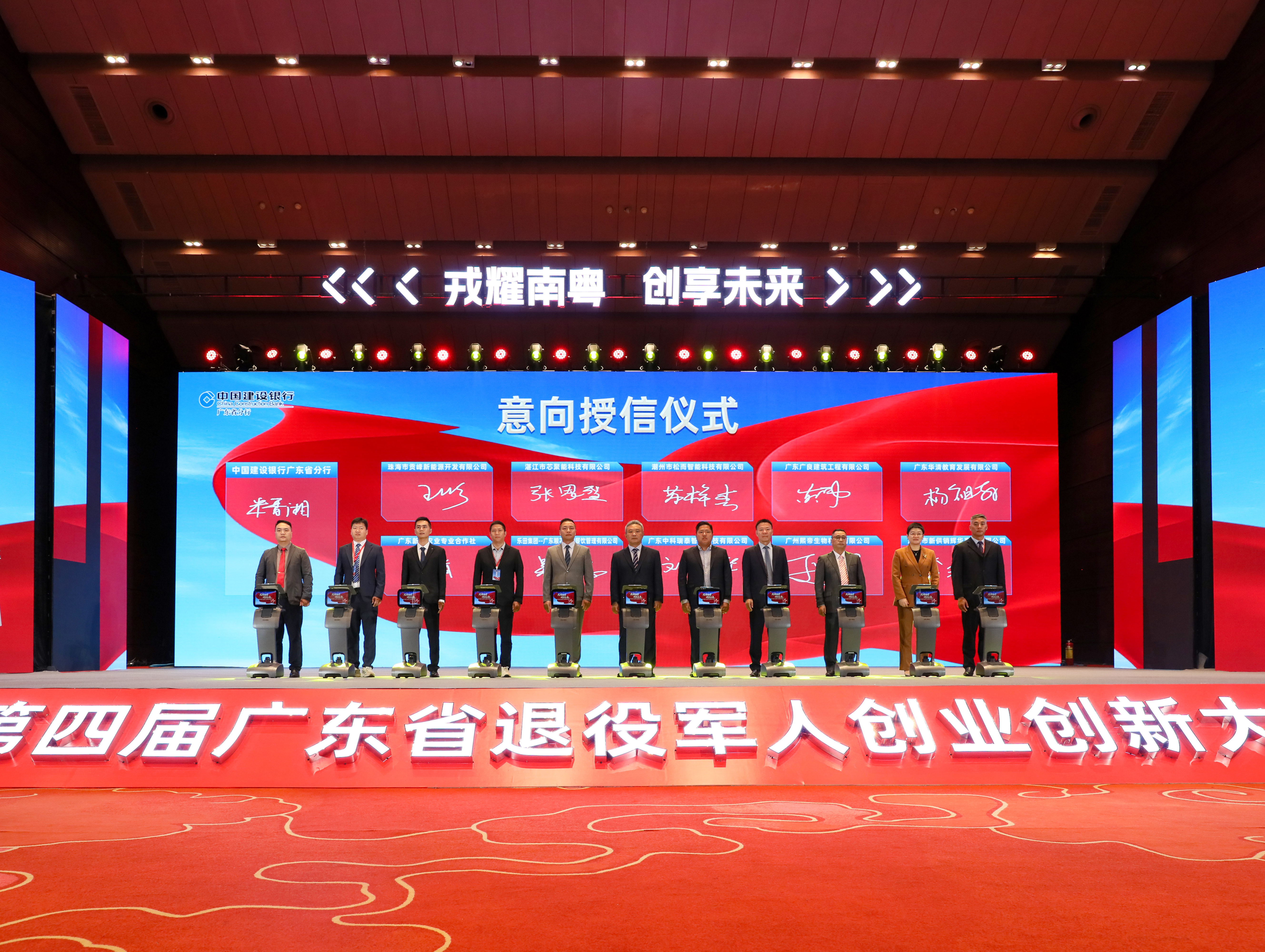 现场,中国建设银行广东省分行对大赛10个项目进行意向授信,并举行了第三届广东省退役军人就业创业先锋故事人物荣誉证书颁发仪式。