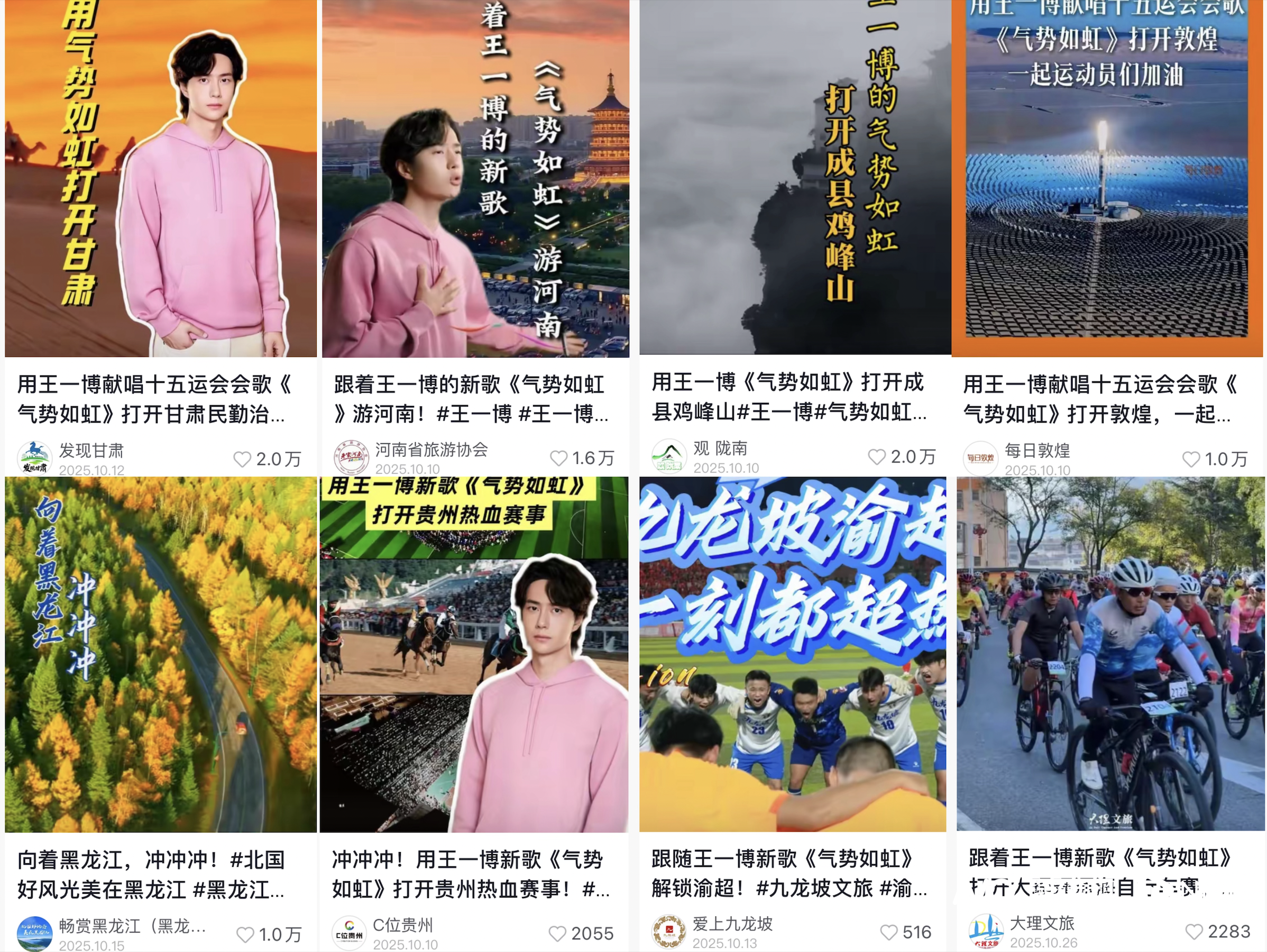 除了校园,《气势如虹》MV和相关视频还大面积出现在地铁站、商场等建筑物的线下大屏。少儿拉丁版、街舞版、古筝版、口琴版、钢琴版、吉他版、唢呐版、阿卡贝拉版……各种舞蹈、乐器、声乐改编版本不断涌现,还有诸如“用《气势如虹》打开甘肃”“用《气势如虹》打开贵州热血赛事”“跟随《气势如虹》解锁渝超”等与文旅、赛事相结合的创意视频,可以说掀起了全民传唱的浪潮。