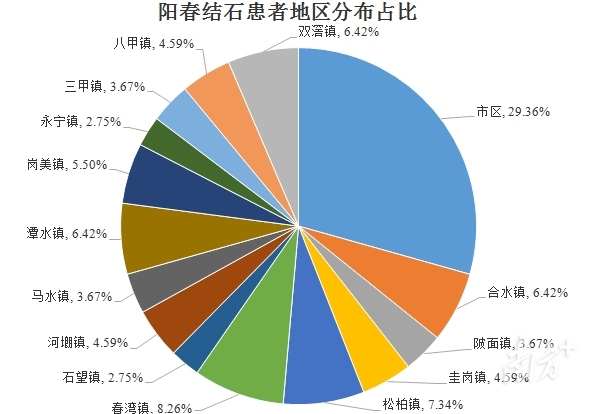 据阳春市人民医院泌尿外科副主任医师林华欣介绍,该科室对住院患者的数据进行了系统分析发现,除河口镇外,泌尿系结石在阳春全市17个镇(街)中均有分布,但患病率存在明显差异。